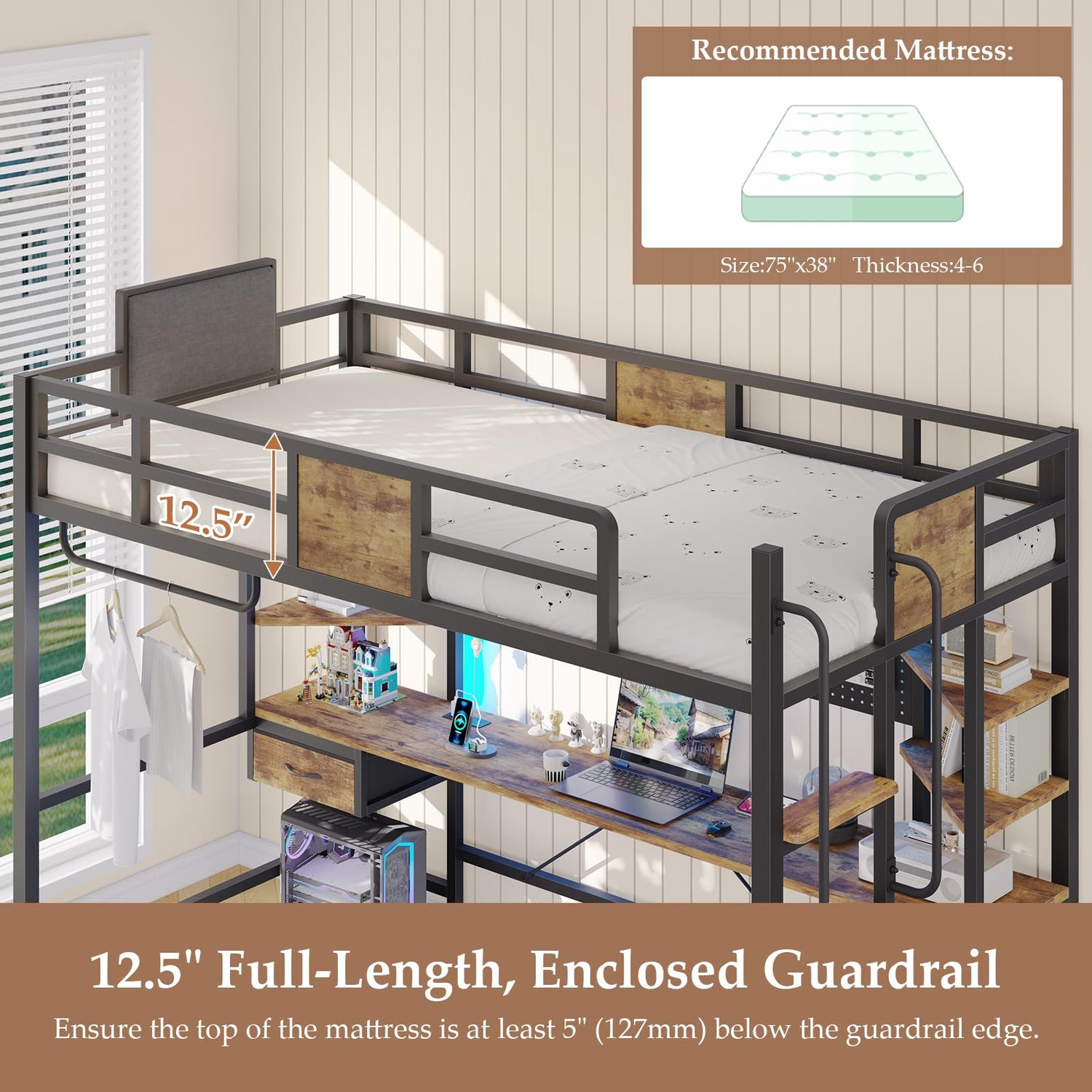 Dnxao Loft Bed Twin Size with Desk,Twin Loft Bed with Storage Organizer,LED Lights and Charging Station, Bunk Bed with Desk, Space Saving, Noise Free, No Box Spring Needed,Rustic Brown