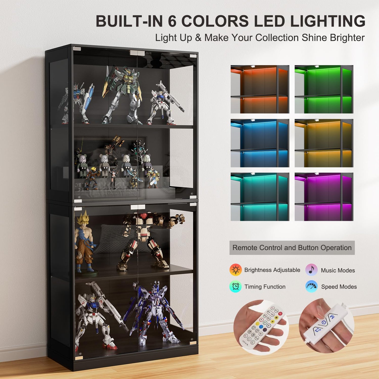 - 6 Color LED Lights: Our display cabinet features 6 color LED lights that add ultimate dazzling display experience and (red/blue/green/purple/yellow/cyan) suitable for different figurine styles, such as battle passion red, sci-fi future blue, and dreamy girl purple. You can use the remote to easily adjust the brightness and flashing mode, creating a dedicated display space