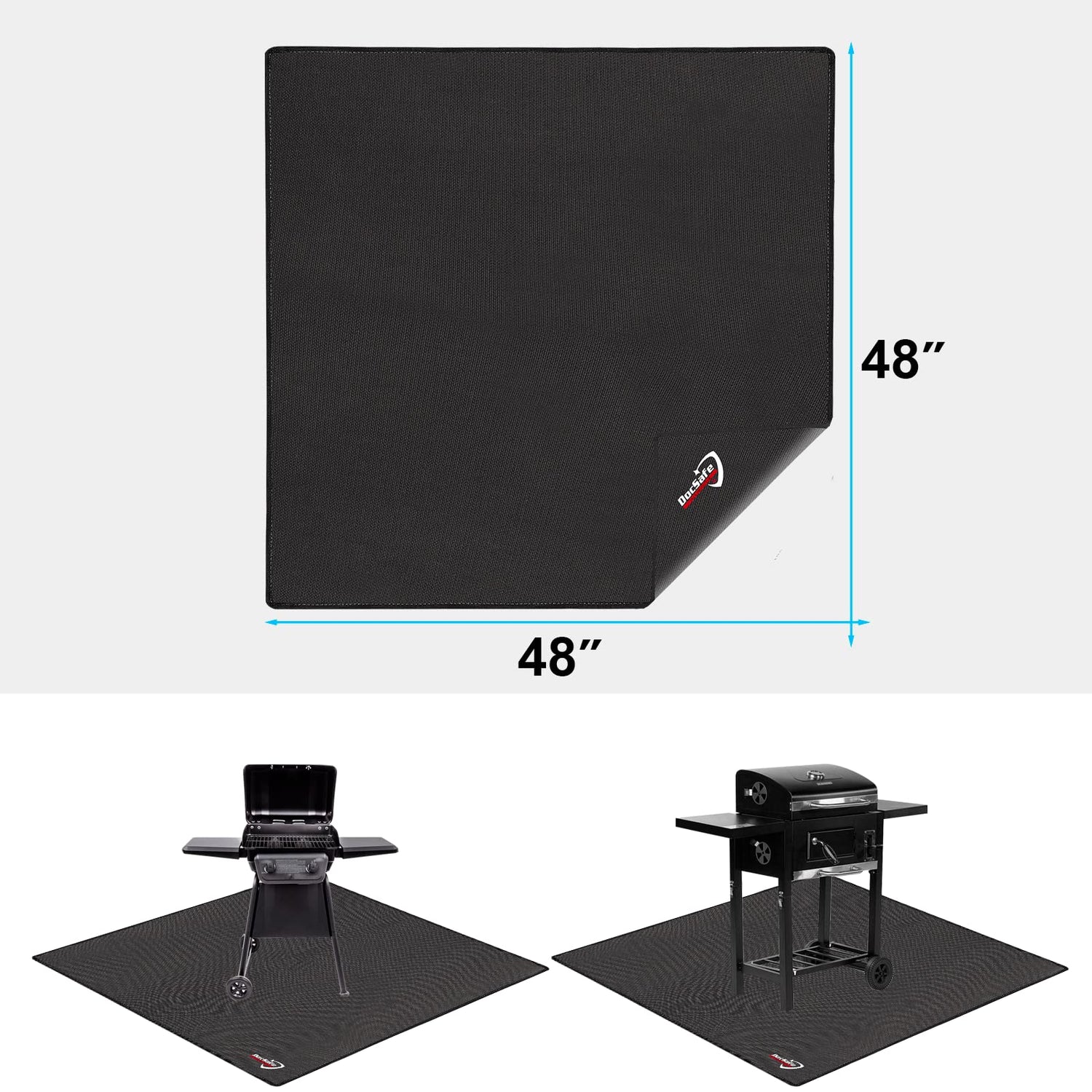 - 48" Square: perfect for fire pits, flat top gas, propane burners and charcoal grills of all shapes from 10" - 48". To ensure the best fit for your grill, please measure the width and depth of your grill before placing your order. Please do not place the heat source directly on the fire mat and keep at least 4 inches of space between the fire pit and the mat.Its black design makes it a perfect match for any barbecue/deck combination.