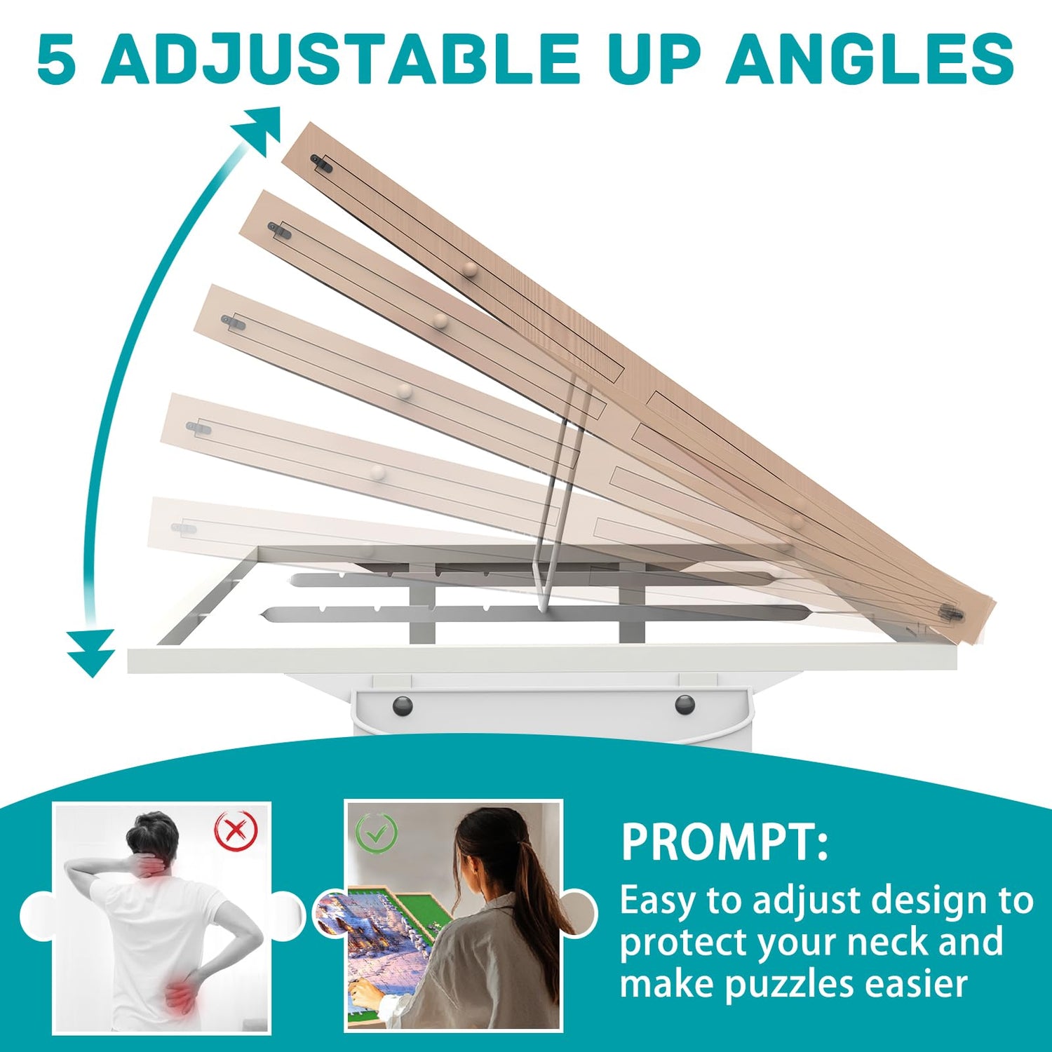- Adjustable 5 Angles:only need to move the iron wire under the puzzle board to choose the Angle you want at will in the five cards,these five gears combine people of different heights and different puzzle habits, making the puzzle more relaxed and comfortable!