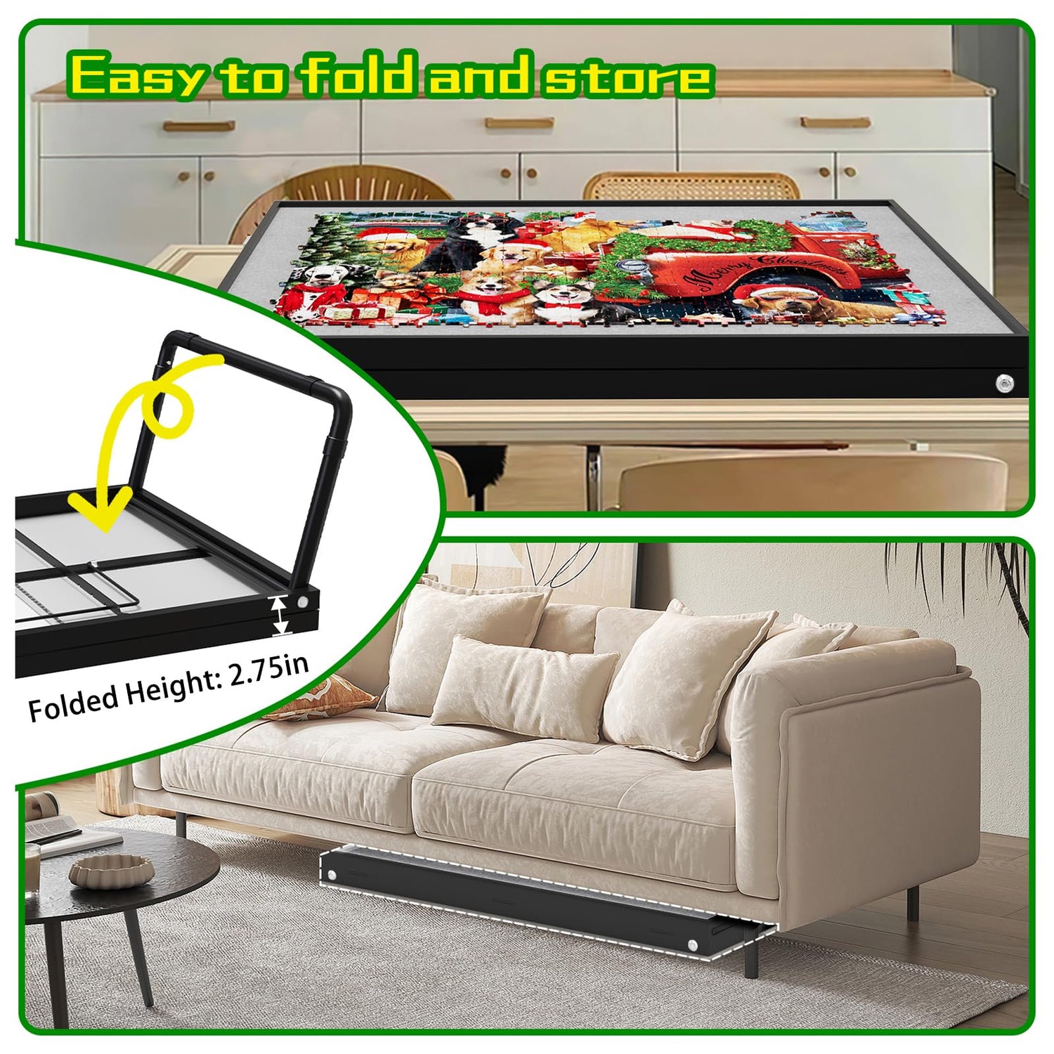 - 2 in1 Design 18inch and 28inch Height:The two adjustable sizes of the jigsaw puzzle table allow you to continue your puzzle anywhere.Do you want to sit on the ground or do puzzles with your kids-adjust to 18 inches,You want to sit on the couch,the chair or the bed?-Adjust to 28 inches.You want to be at the living room table with the family?-Fold it up and put it on the table.