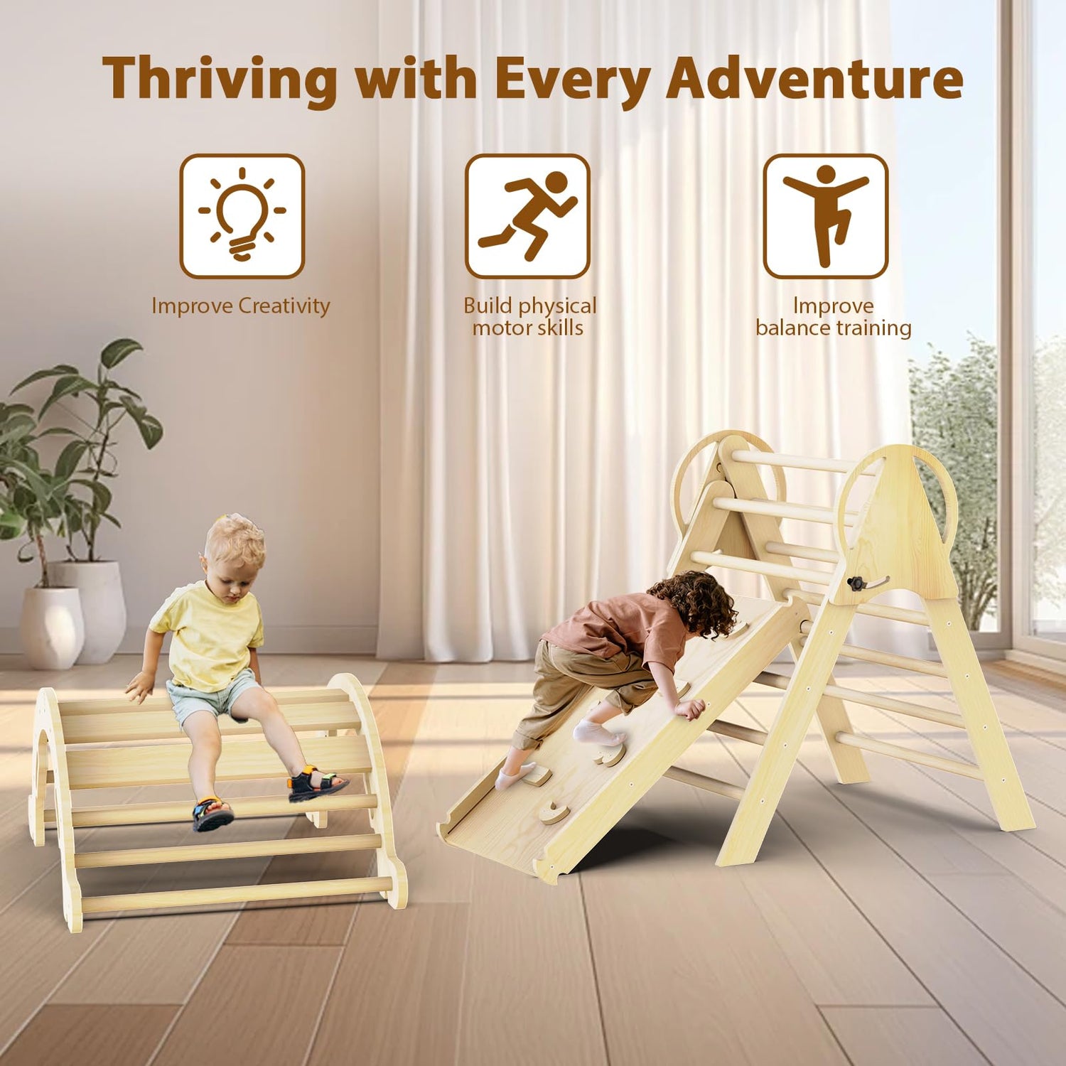 Doerpuz Pikler Triangle Set 7 in 1,Foldable Baby Climbing Toys Wooden,Toddler Climbing Toys Indoor,Climbing Toys for Toddlers 1-3,with Ramp, Arch and Ladder(Nature Wood)