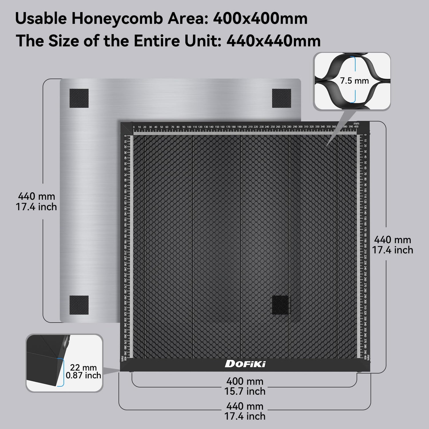 - Actual Size: Usable honeycomb area 400mm x 400mm (15.7 x15.7 inch), measurement markers 0 ~ 400mm. Entire unit size 440mm x 440mm x 22mm.