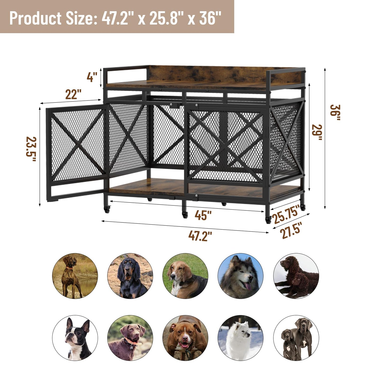 Dog Crate Furniture 48 Inch Wooden Dog Kennel for XLarge Dogs, Heavy Duty Dogs Furniture Indoor Wire Dog Cage with Adjustable Feet & 360° Wheels, Decorative Pet House End Table, Antique Brown