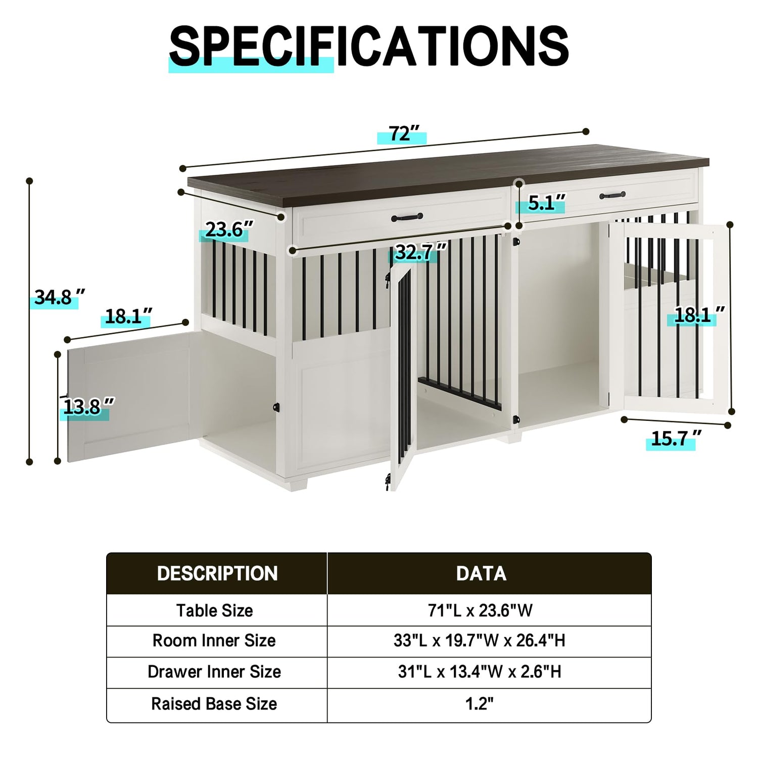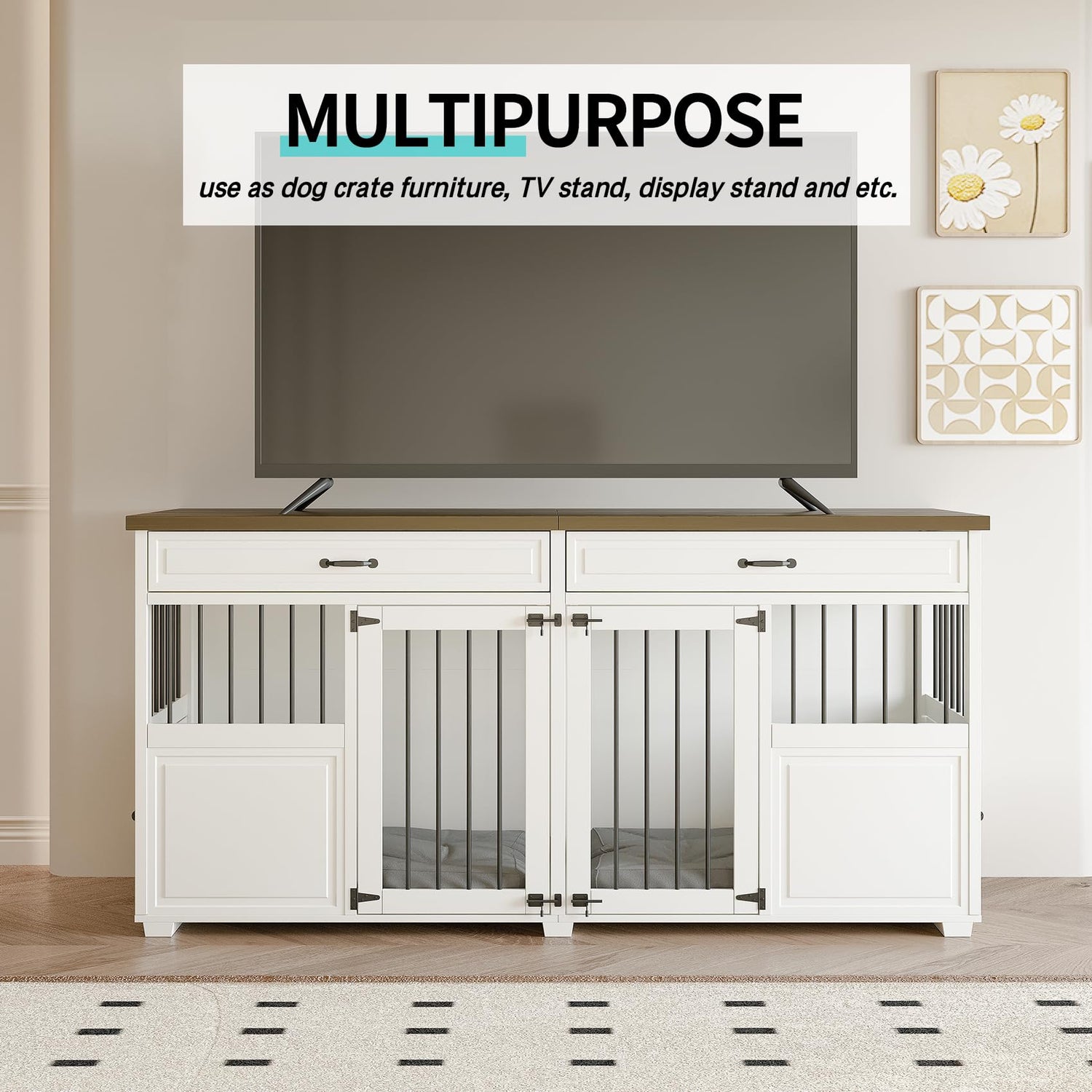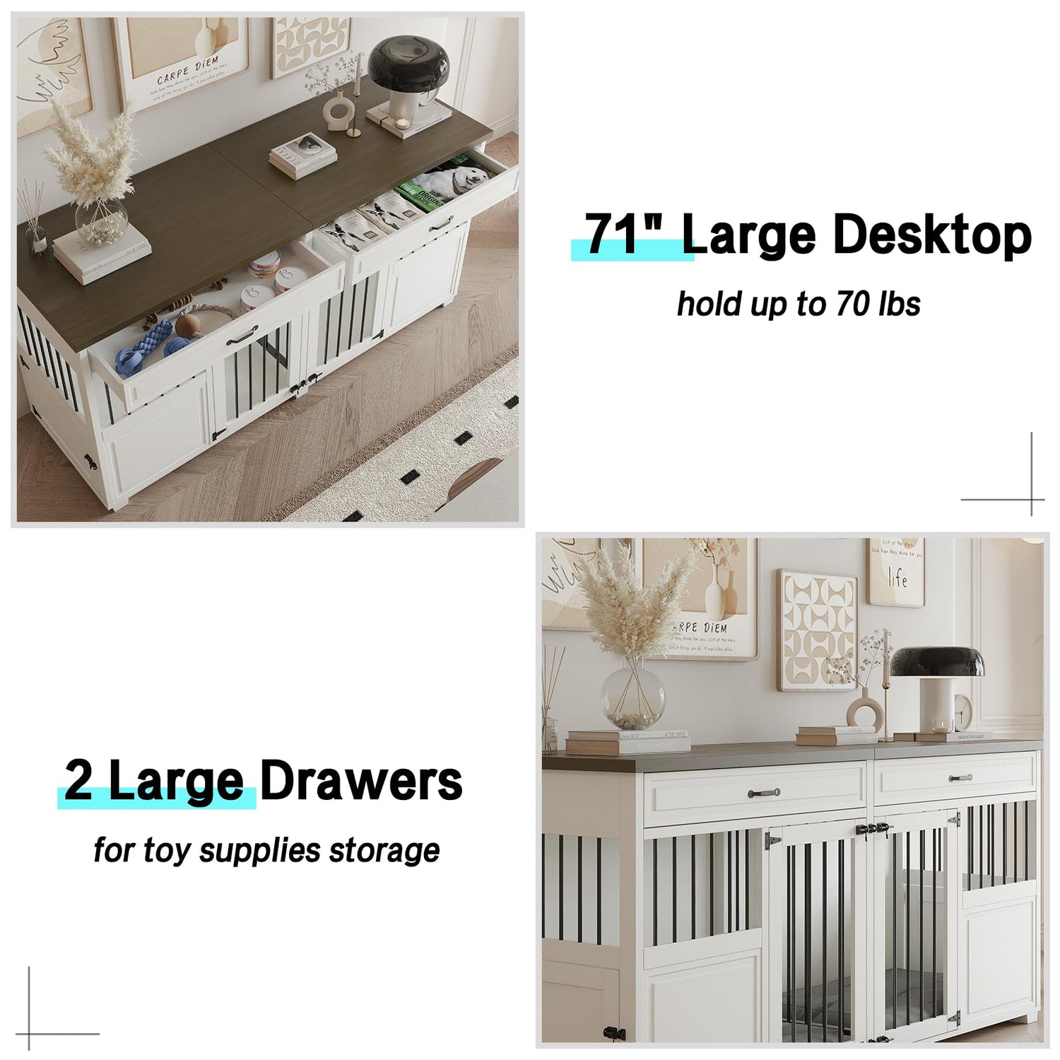 - MULTI-PURPOSE DOG CRATE FURNITURE - This furniture-inspired dog crate features a large 72"x 23.6" tabletop that can support up to 70 pounds. It's not just a dog crate, it can also serve as a TV stand, display shelf, plant stand, and more. The adaptability of this crate furniture offers a perfect fusion of practicality and style to your living space.