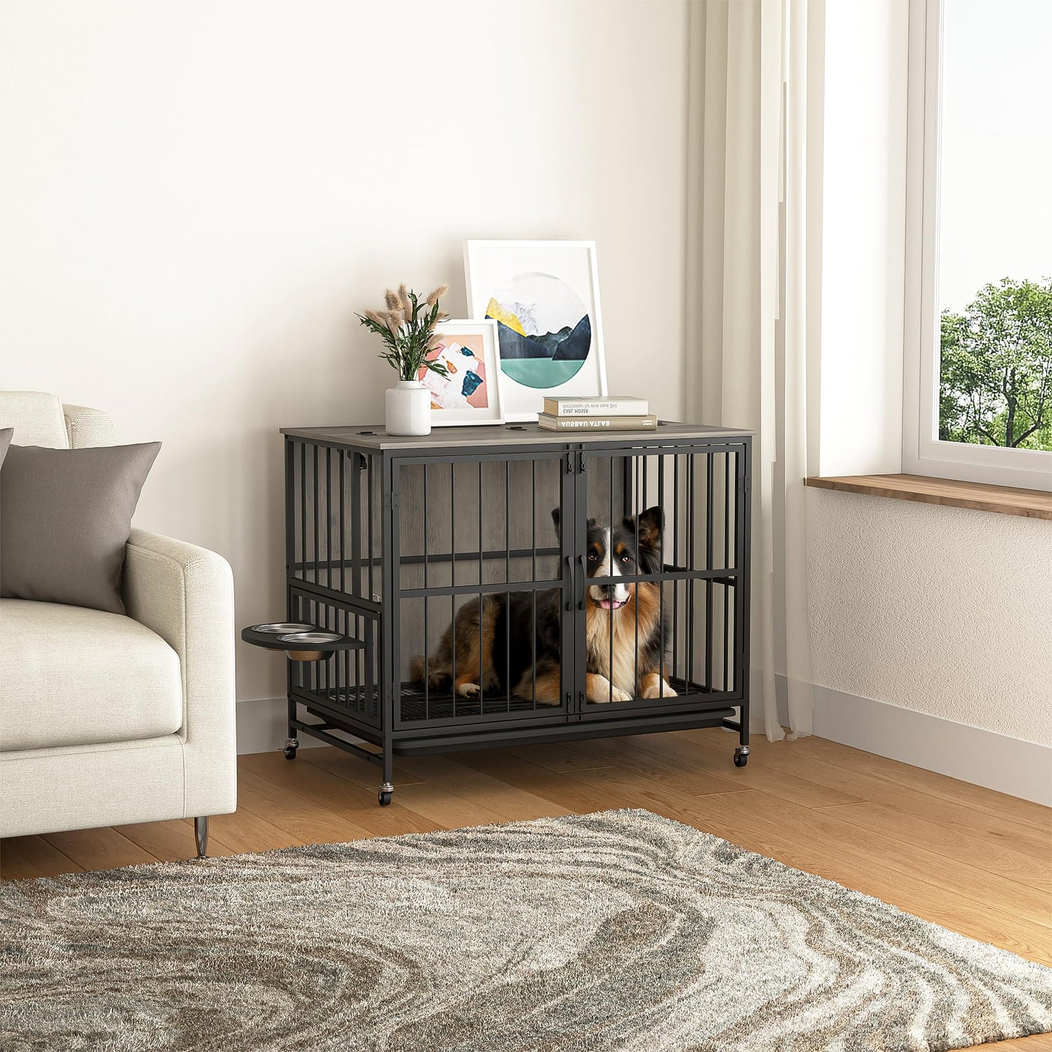 Dog Crate Furniture, Modern Dog Crate Table for Medium Large Dogs, Wooden Dog Kennel Indoor End Table with Removable Tray, Double-Door Dog House with Wheels, Heavy Duty Dog Cage with Flip-Top (Grey)