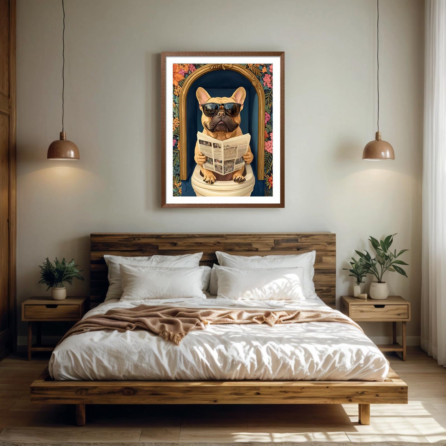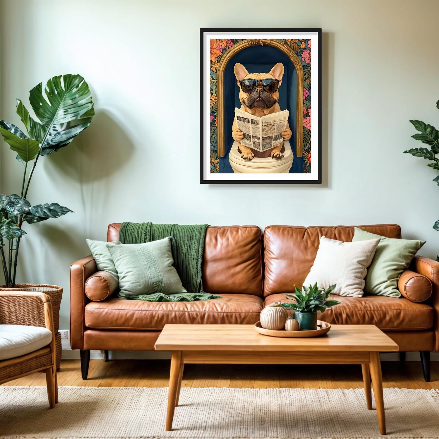 - Vibrant 5D diamond art kit: full round drill diamonds creates a stunning 3D effect on a 12x16 inch canvas. Features a humorous French Bulldog in sunglasses reading a newspaper on the toilet, set against vibrant pop-art floral arches. Perfect whimsical decor for bathroom, living room, or bedroom.