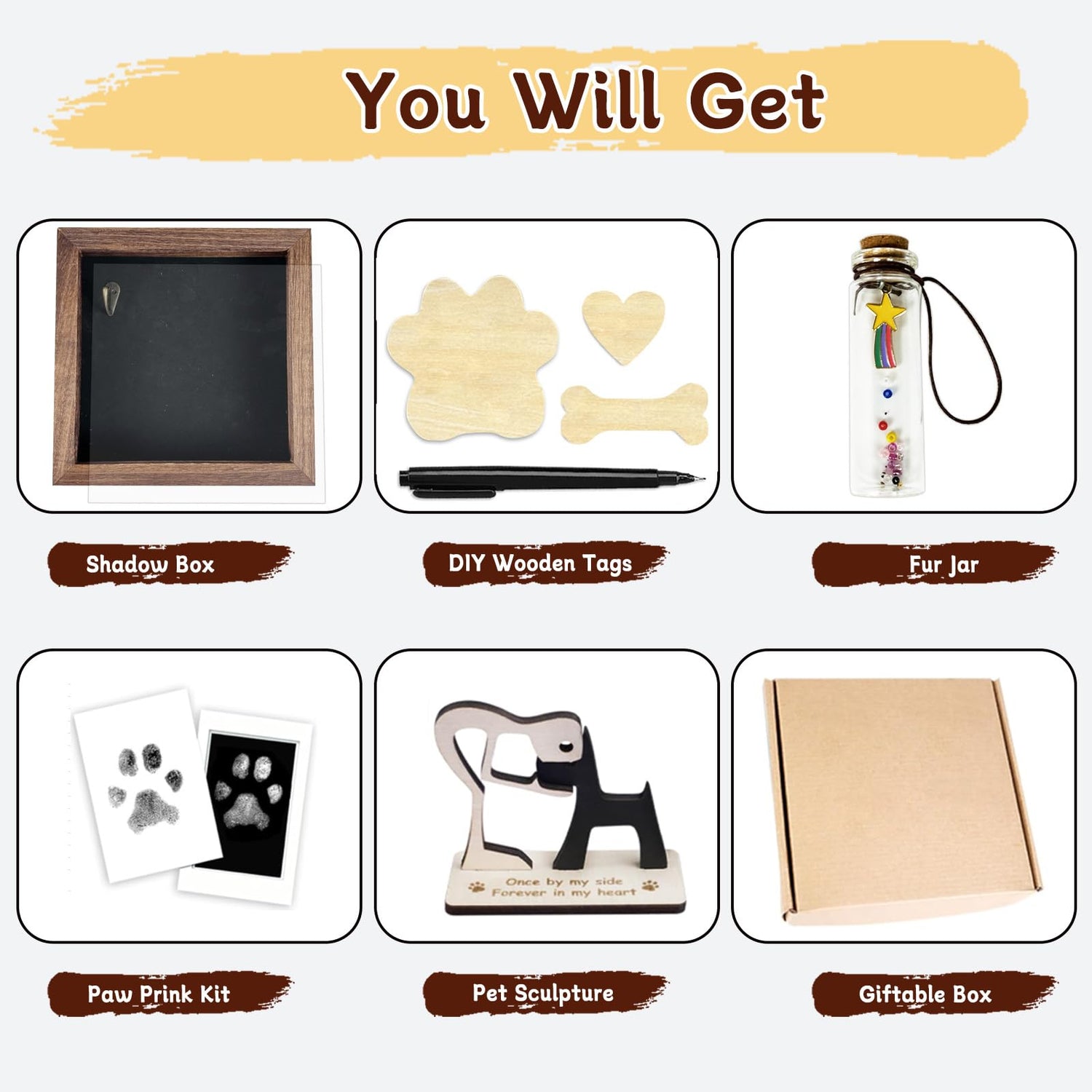 - Dog remembrance gifts kit: Pet memory frame comes with 1 collar metal holder, 1 vintage wooden frame with acrylic cover, 1 paw print kit, 1 glass fur jar, 1 pet sculptures, 3 handwritten tages, and 1 pen for you to write your pets name