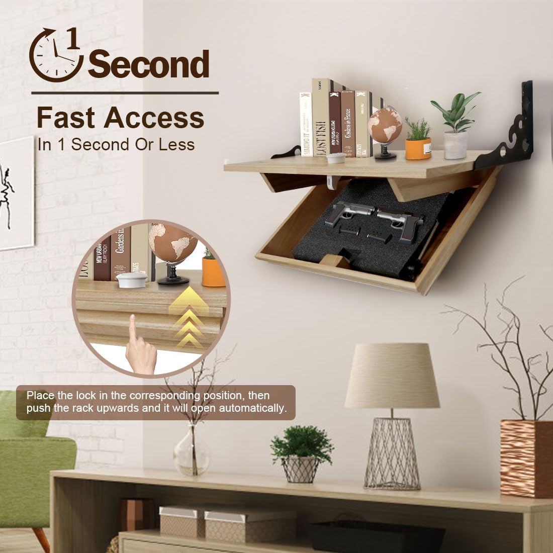- Gun Shelf with Hidden Storage: Our hidden gun storage is designed with the appearance of a common floating rack, integrating seamlessly with the furniture, providing a prudent solution for the safe storage of firearms. This compact gun shelf is an ideal choice for any space, from the living room to the home office.