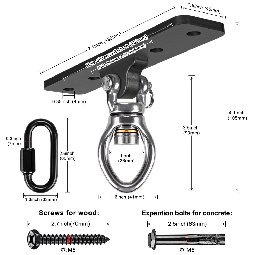 - Easy to Install: Include8 expansion bolts and 8 wood screws. There are 4 holes in the base of the swing hanger, and use screws through this hole to fix it on the concrete ceiling or wooden beam. The swing ring with carabiner, even if your chain, rope or connecting buckle is closed, it can be connected. So it can be easily connected to items such as the hammock, swing chair or sandbag that you need to hang.