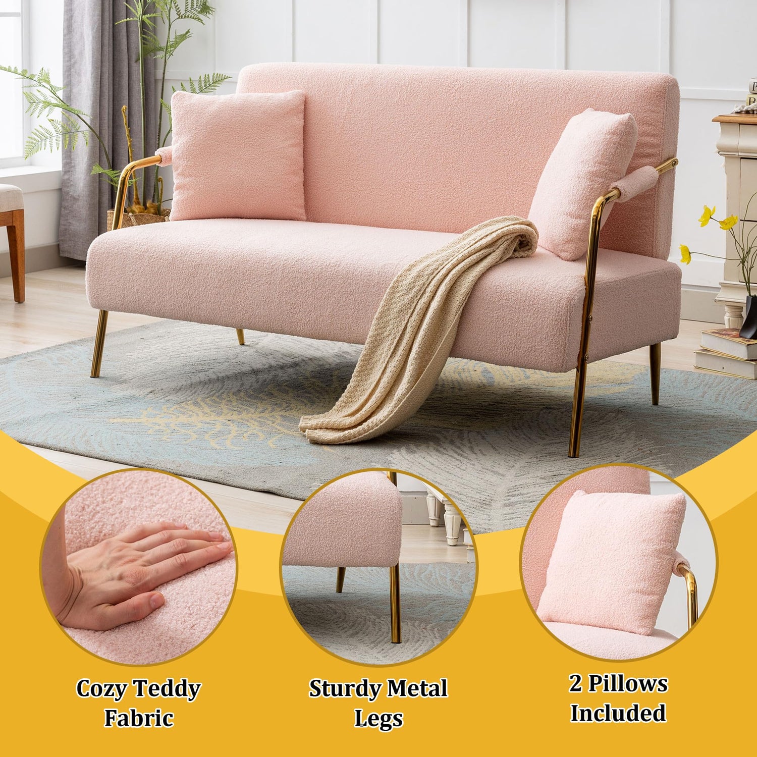Dolonm 60" Bouclé Loveseat Sofa, 2 Seater Upholstered Sofa Couch with 2 Pillows, Mid Centry Teddy Fabric Sofa with Gold Metal Legs, Sofa for Small Space, Apartment, Office, Bedroom