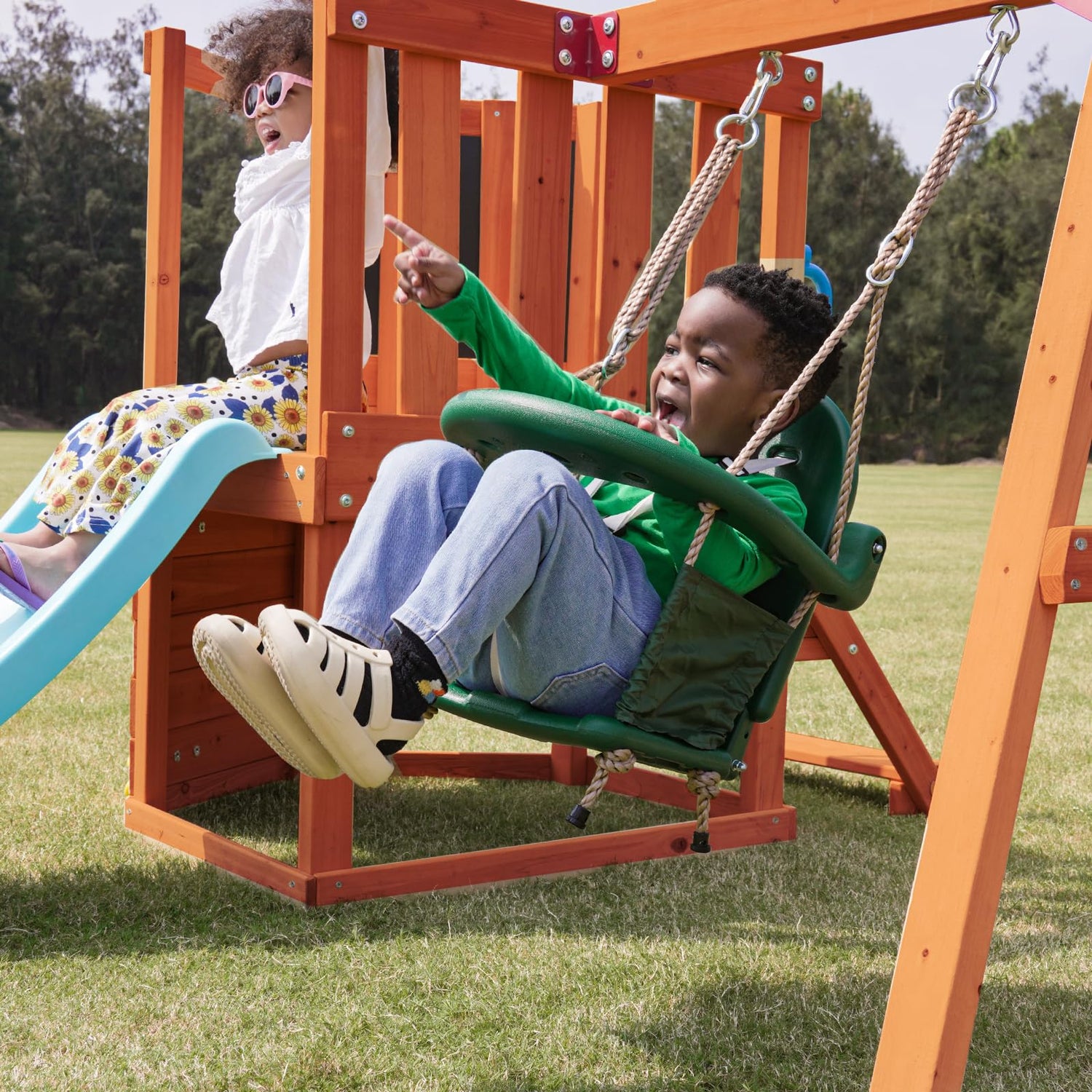 - 5 IN 1 FUN: Our swing includes a toddler swing seat, outdoor table, blackboard, slide, and climbing wall; suitable for children who like to climb, slide, and swing; as an entry-level swing, it meets most of the needs of children ages 18mo to 4yrs