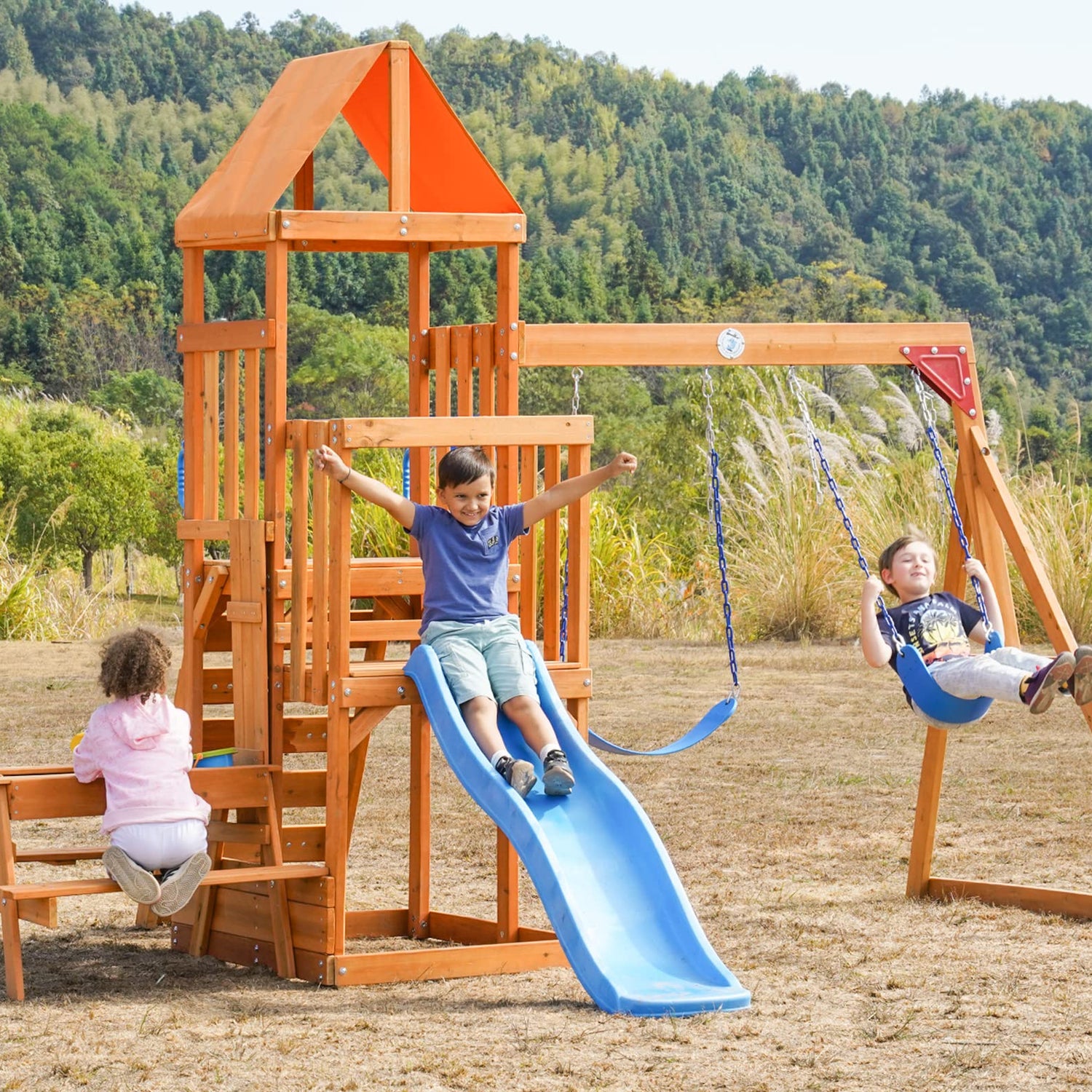 - BACKYARD PLAYGROUND SET: Our swing set contains 2-in-1 outdoor table, 6FT wave slide, 2 belt swings, climbing wall and fort with telescope; please check that your backyard can accommodate this product before purchasing; No Monkey Bar