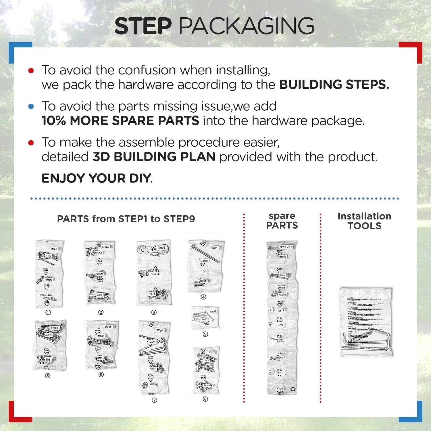 - ORDERLY PACKAGING: In order to avoid the confusing when installation, we pack the hardware according to the building steps; add 10% more spare parts into the hardware package; detailed 3D building plan makes the assemble procedure easier