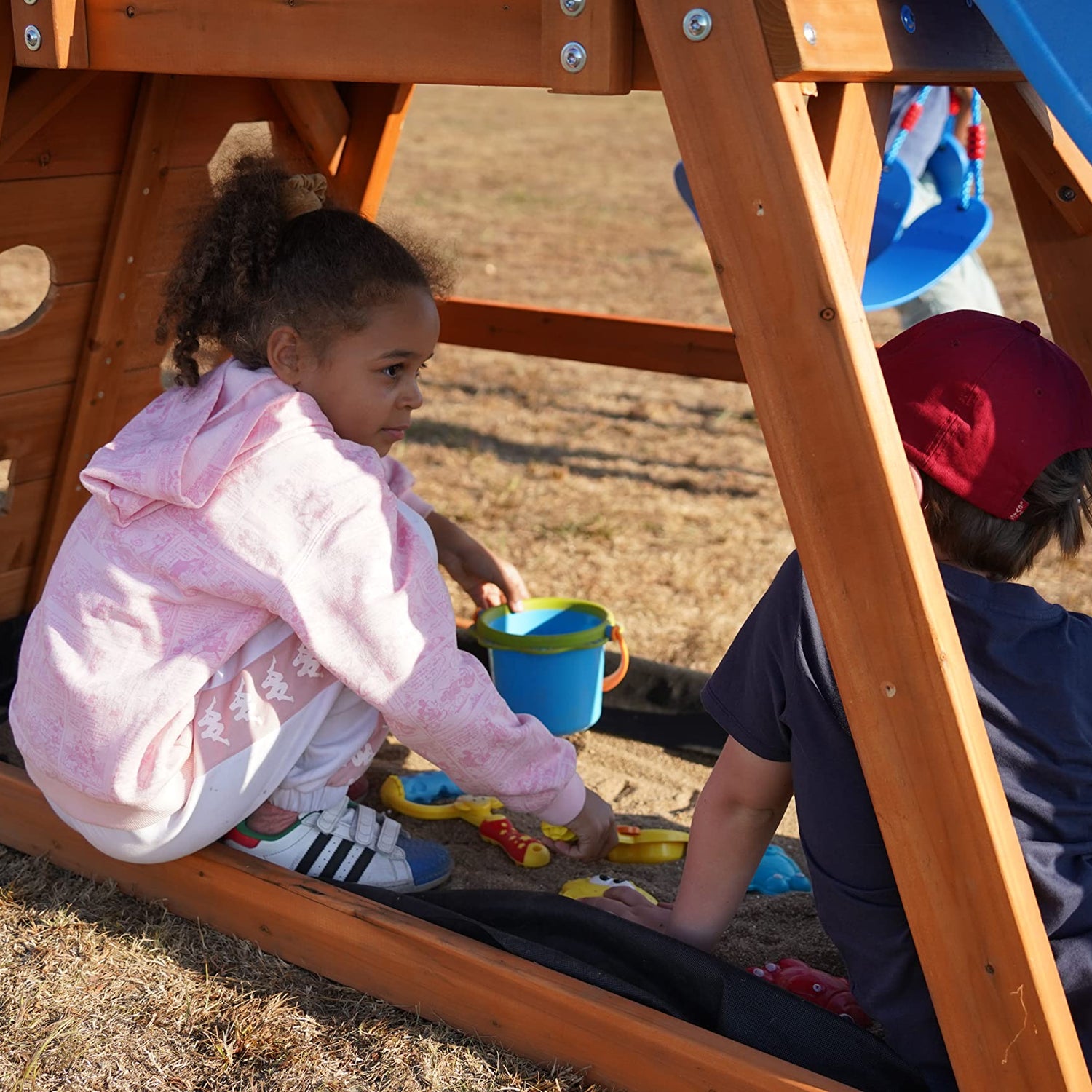- π‘γπ΄πππππππ πππγ: Our swing set includes 6 ft slide, 2 belt swings, fort with canopy, geometric climbing wall and sandbox. Fully assembled measures 103.03 x 105.90 x 90.04 inches. Multiple combination parts allow children to enjoy the fun of the playground. Please check that your backyard can accommodate this product before purchasing.
