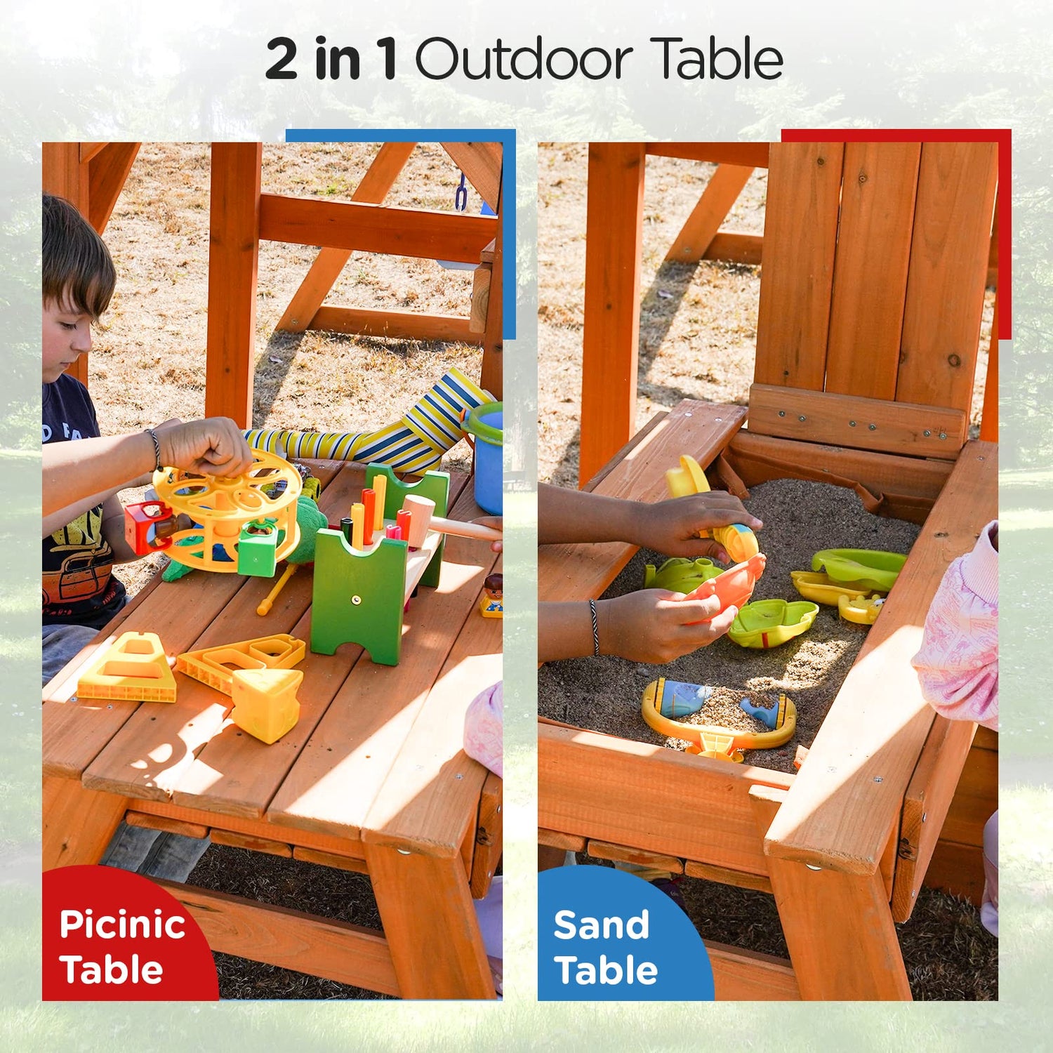 - 2 IN 1 OUTDOOR TABLE: It could be used as picinic table, toy display or talk with friend; but when the table cover opened, the table would be change to an amazing storage table, it can be used as a sand table or put the toys in it