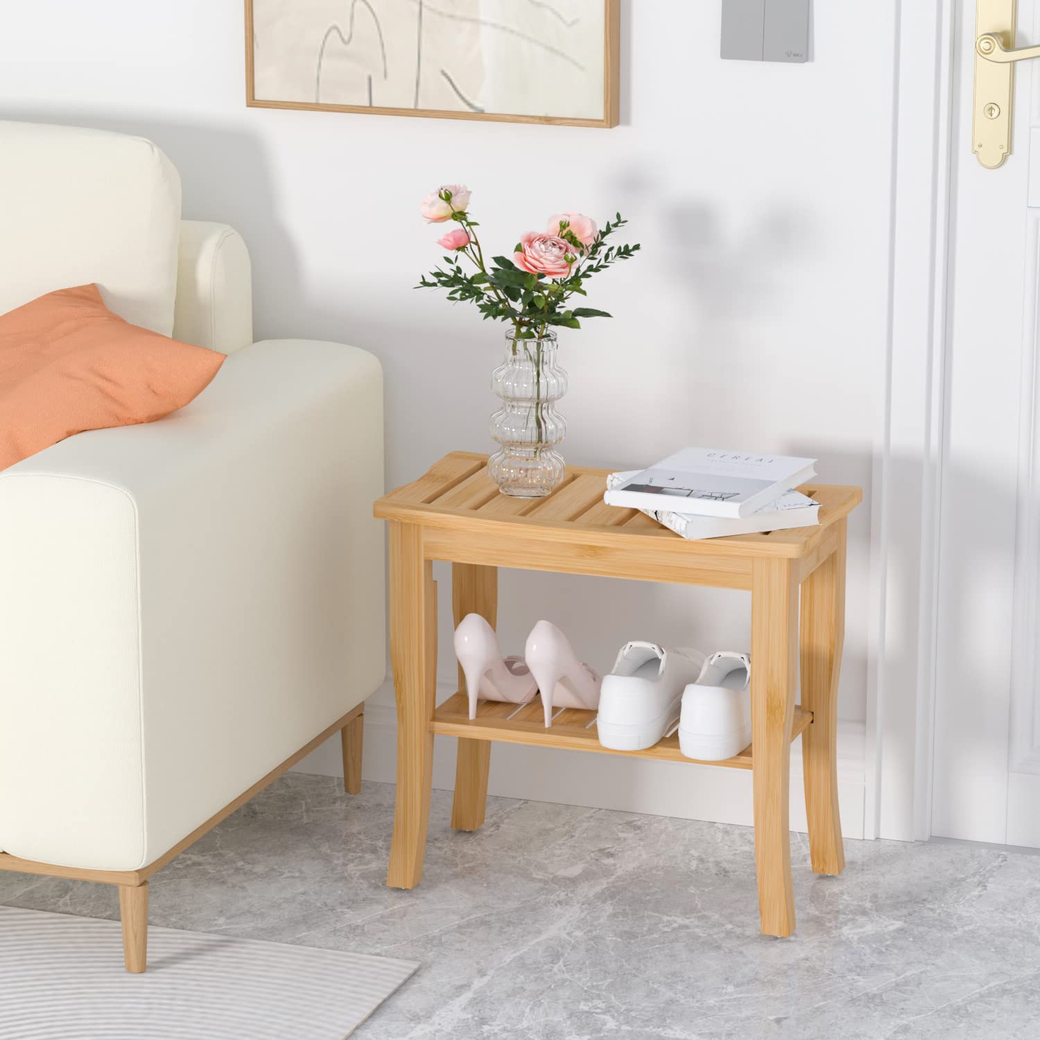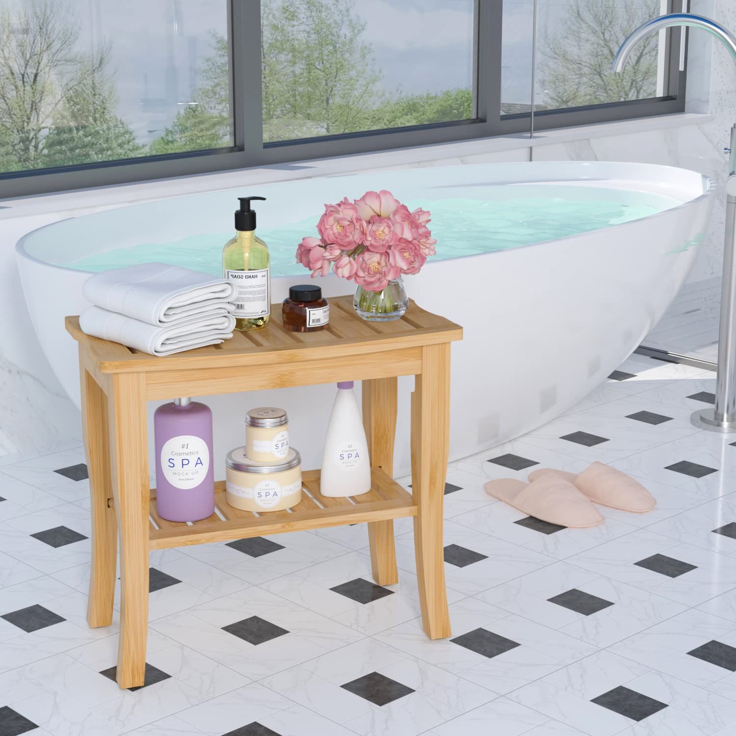 - ✅ MULTIFUNCTION: The bamboo wooden shower stool is not only great for shaving legs, but also perfect for a bench/table beside bathtub, toilet, bed, sofa, or chair. Fits in the bathroom, bedroom, living room, entryway, sauna, garden, balcony, patio, etc.
