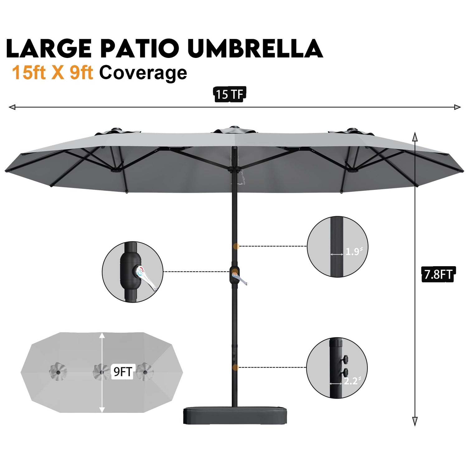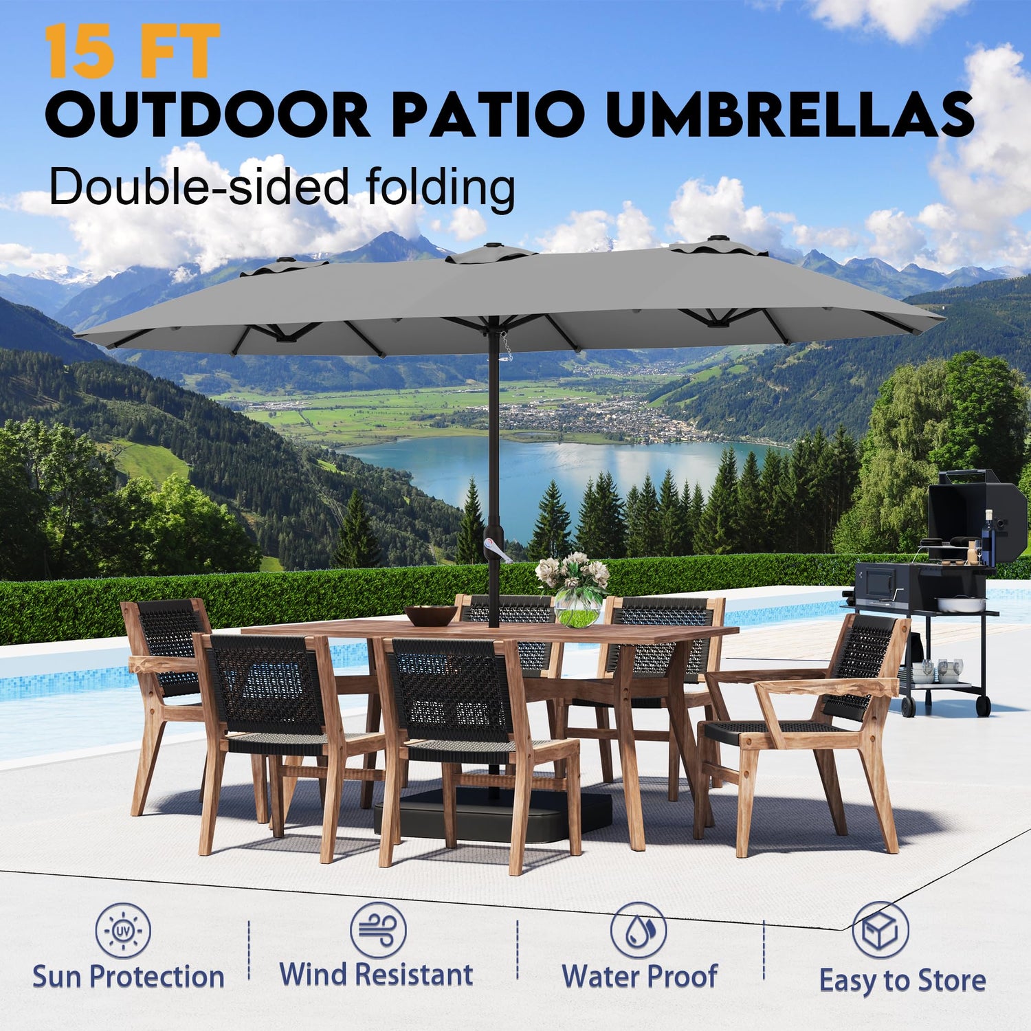 DomeShade 15ft Patio Umbrella with Base,Large Outdoor Double-Sided Rectangle Umbrella with Crank Handle, Market Umbrella for Poolside Garden Deck Backyard Beach Pools, Gray