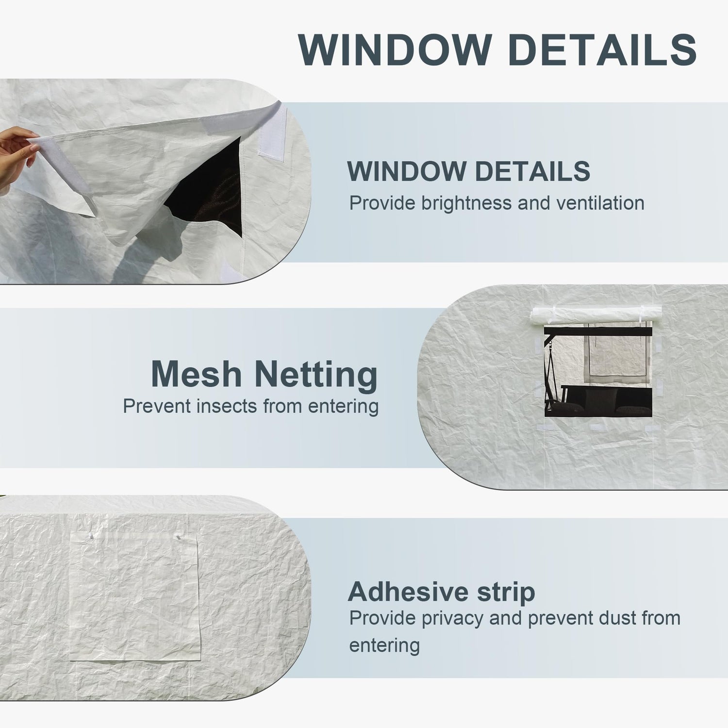 - Comfortable Experience: Featuring a zippered door for easy access, mesh curtains for ventilation and dust control, the Domi gazebo cover ensures privacy while keeping your space breathable and protected. Embrace each season’ s charm, reassured that your outdoor oasis remains airy, pest-free, private, and dust-protected.