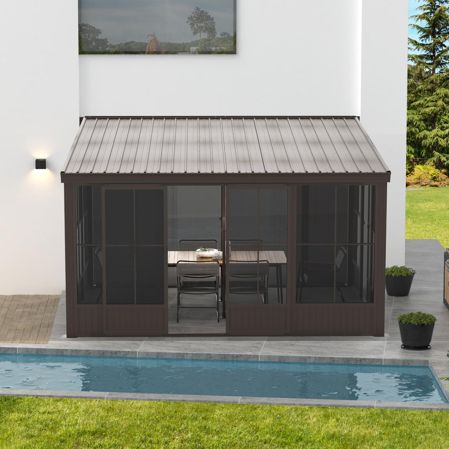 - 🌞Versatile Usage-Domi stylish enclosed gazebo has various uses,it make excellent living spaces,dining areas,home offices or even exercise rooms.The transparent walls can let in sunlight while protectingdelicate plants,as a small greenhouse.Or turn the sunroom into a spa-likeretreat by adding a hot tub.