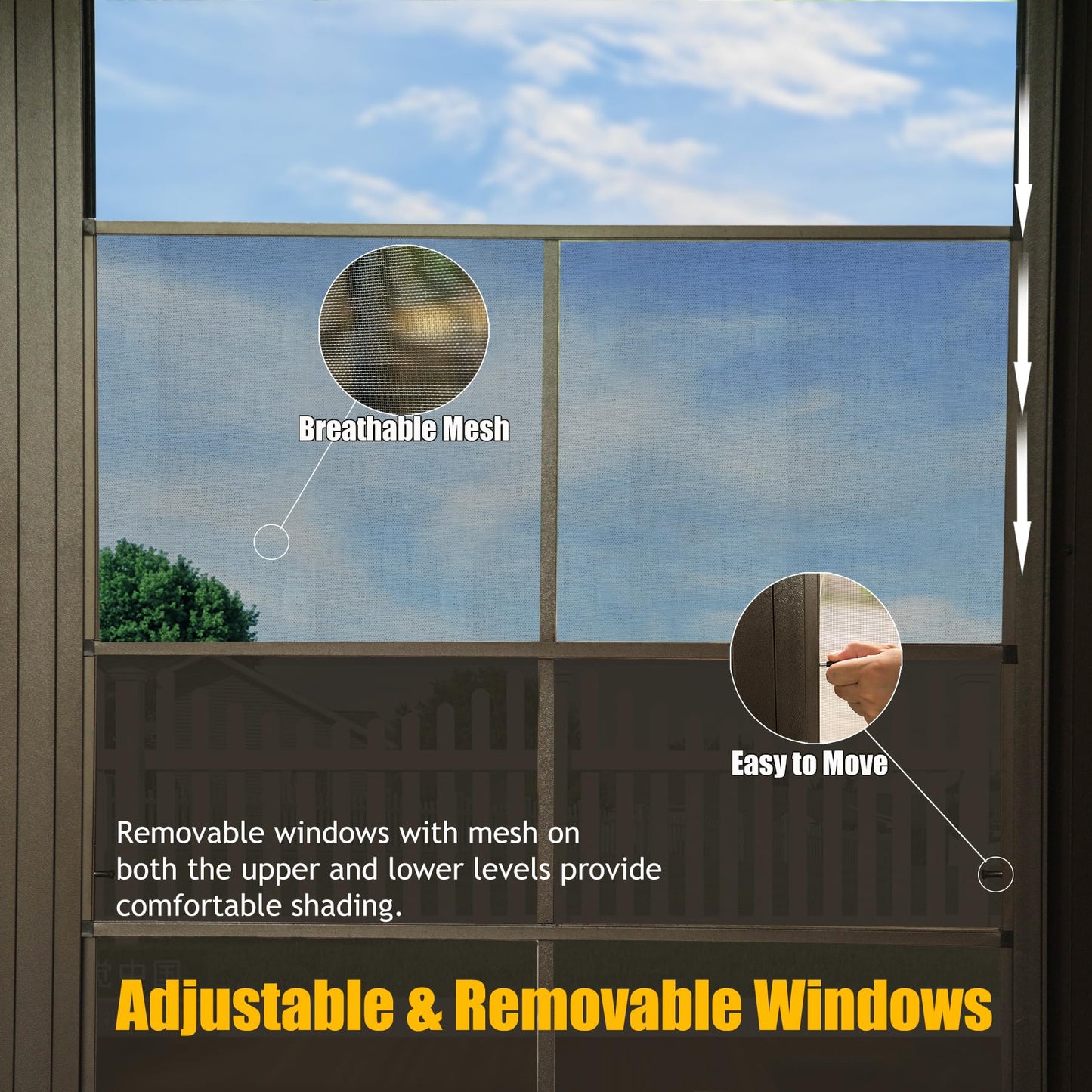 - ☀️Permanent Mesh Screens: Domi sun house is thoughtfully designed with mesh screens that remain in place, ensuring an uninterrupted outdoor retreat experience even when the PVC windows are removed. Keep bothersome disturb away and create a secure and tranquil outdoor haven for your moments of leisure.