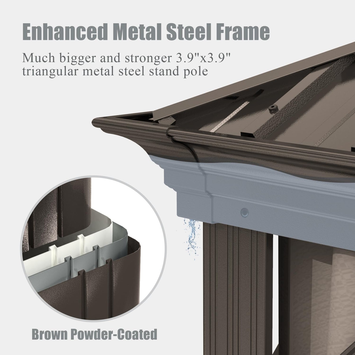 Domi 10x14 FT Outdoor Gazebo, Hardtop Gazebo with Galvanized Steel Double Roof, Metal Gazebos with Drainage System Patio Pergola for Patio Deck Backyard,Curtain and Netting, Brown