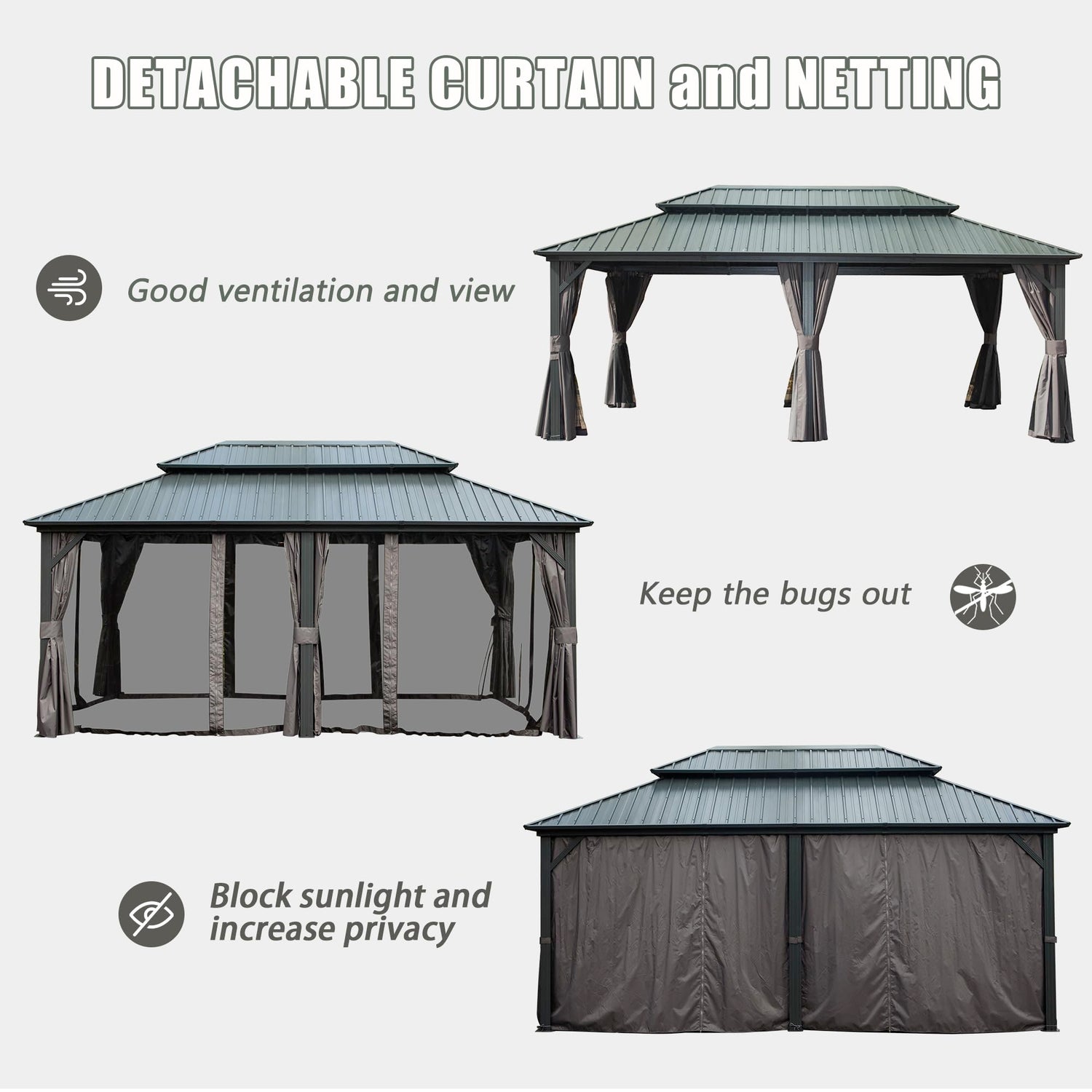 • Included Netting & Curtains: The hardtop gazebo 10x14 designed with double-track detachable sidewalls and double-sided zipper for quick sliding.The bugs netting maintain good ventilation and open view.The privacy curtains provide a safe and comfortable space and also keeps the space warm.