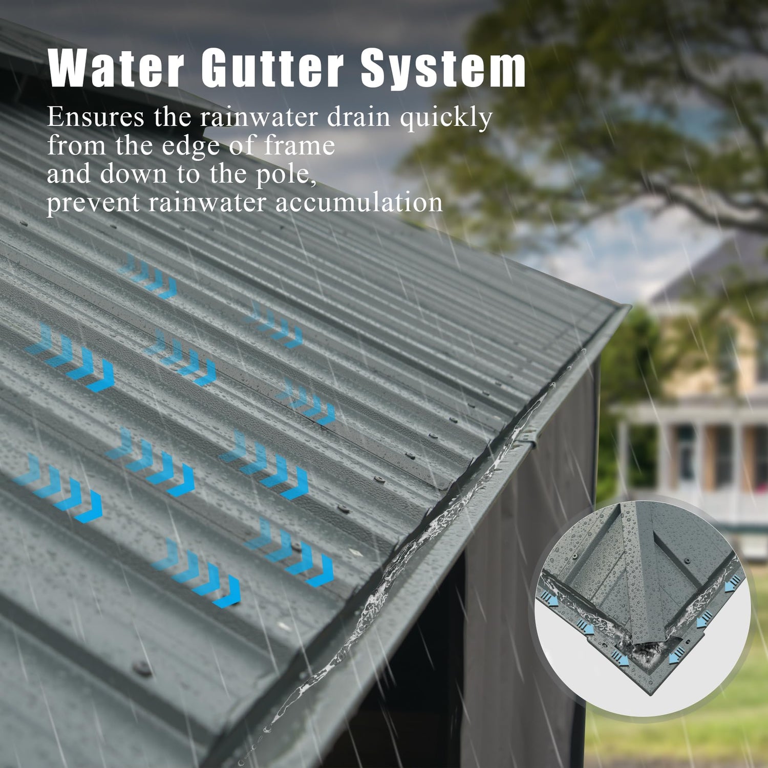 - Drainage System Design: Sloped roof designed to allow water to drain quickly, and the water gutter design of this domi gazebo ensures the rainwater drain quickly from the edge of frame and down to the pole,prevent rainwater accumulation