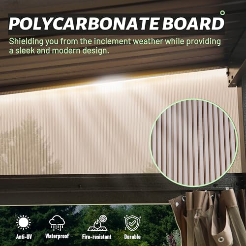 - Premium Polycarbonate Side Panel- The trait of semi-transparent panel makes natural light filter through while provides protection against harmful UV rays, creating a bright and inviting outdoor space for you.