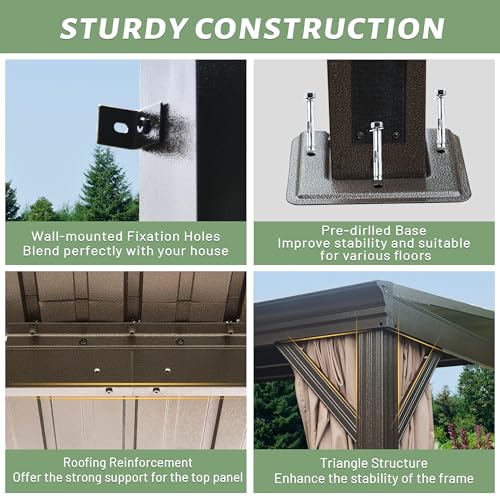 - Built for All-Weather Durability- Equipped with a robust galvanized sloped roof, domi 12’x16’ wall-mounted gazebo offers exceptional weight-bearing capacity, supporting up to 2500 lbs. Its innovative sloped roof design ensures efficient drainage of rain and snow, effectively preventing water buildup and potential damage during harsh weather conditions.
