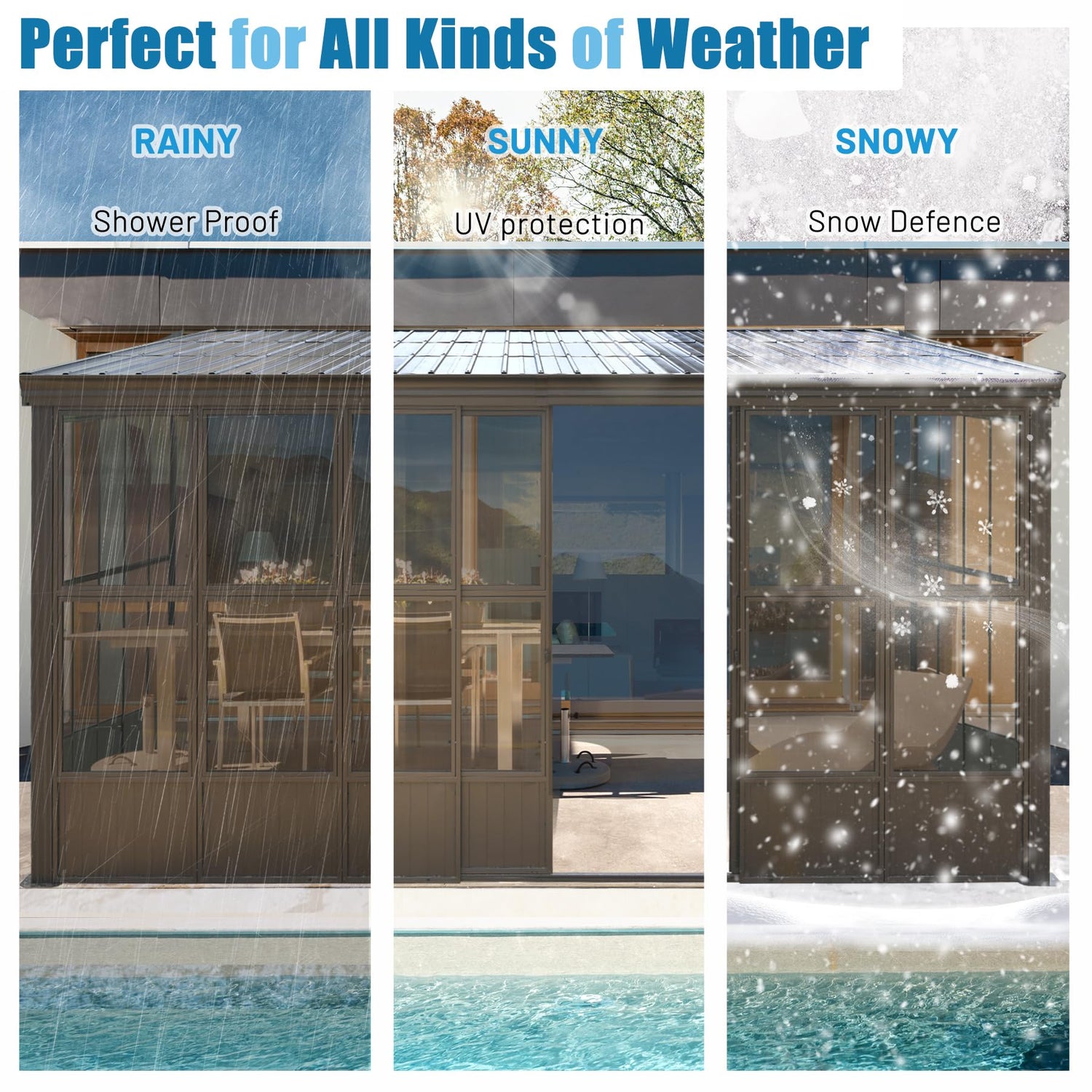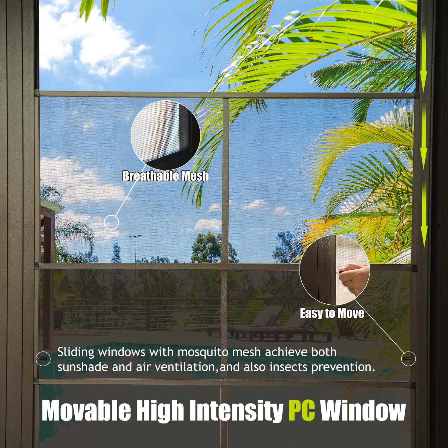 - DETACHABLE PC SCREEN: Powder-coated thick aluminum frame with high-intensity detachable dark brown 6mm PC screen. Adjustable for varying sunlight. PC side walls enhance room lighting.