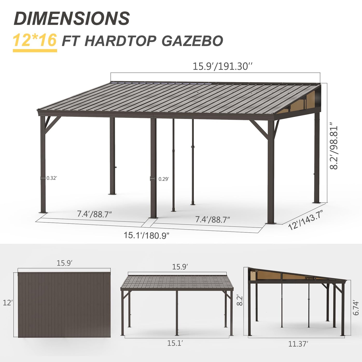 - 🏡🌞Extend Space with Wall Mounted Gazebo - The 12x16 lean to hardtop gazebo extends your private space to a large extent. Install the domi gazebo at the entrance of your home, you can enjoy your afternoon tea time leisurely. The pc panel on the side can protect you from small rain and partially block the sunlight