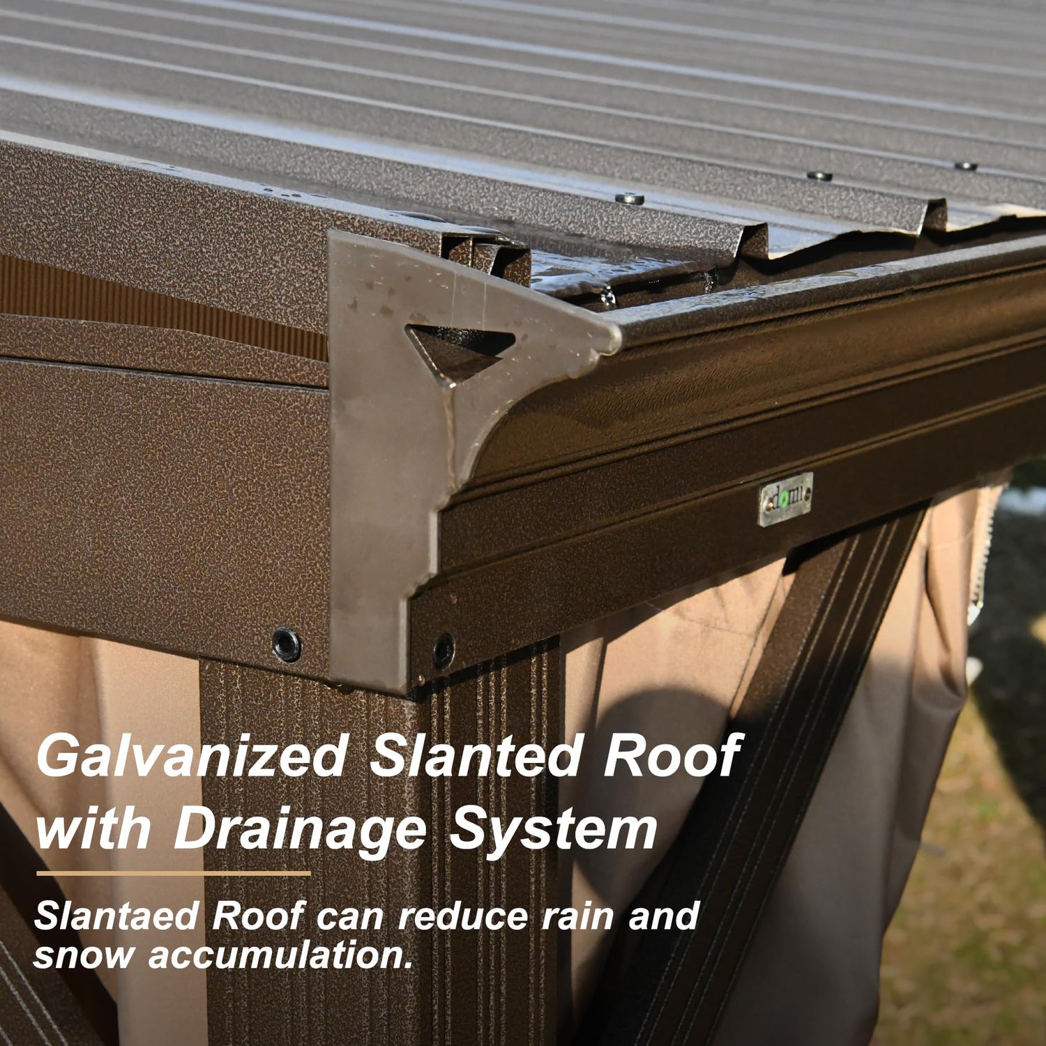 - 🏡🌞Slope & Hidden Gutter System - The domi wall mounted gazebo 12x16 is designed with slopes and flutes to help rainwater and snow water drain quickly. Water that runs down the slope of the galvanized steel roof will flow along the gutter to the poles, ensuring that you won't be hit by rain when you enter or exit on a rainy day.