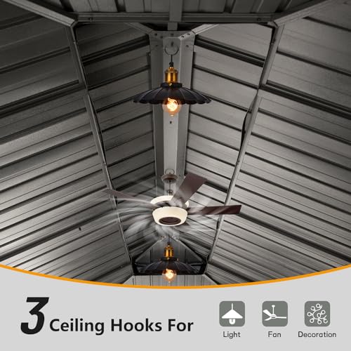 - ❤️Effortless Ambiance with Sturdy Hooks- Elevate your hard top gazebo's functionality with 3 sturdy hooks! Each hook can effortlessly support up to 20 LBS, making it easy to hang lights, fans, or decorations. Create your ideal outdoor ambiance effortlessly.