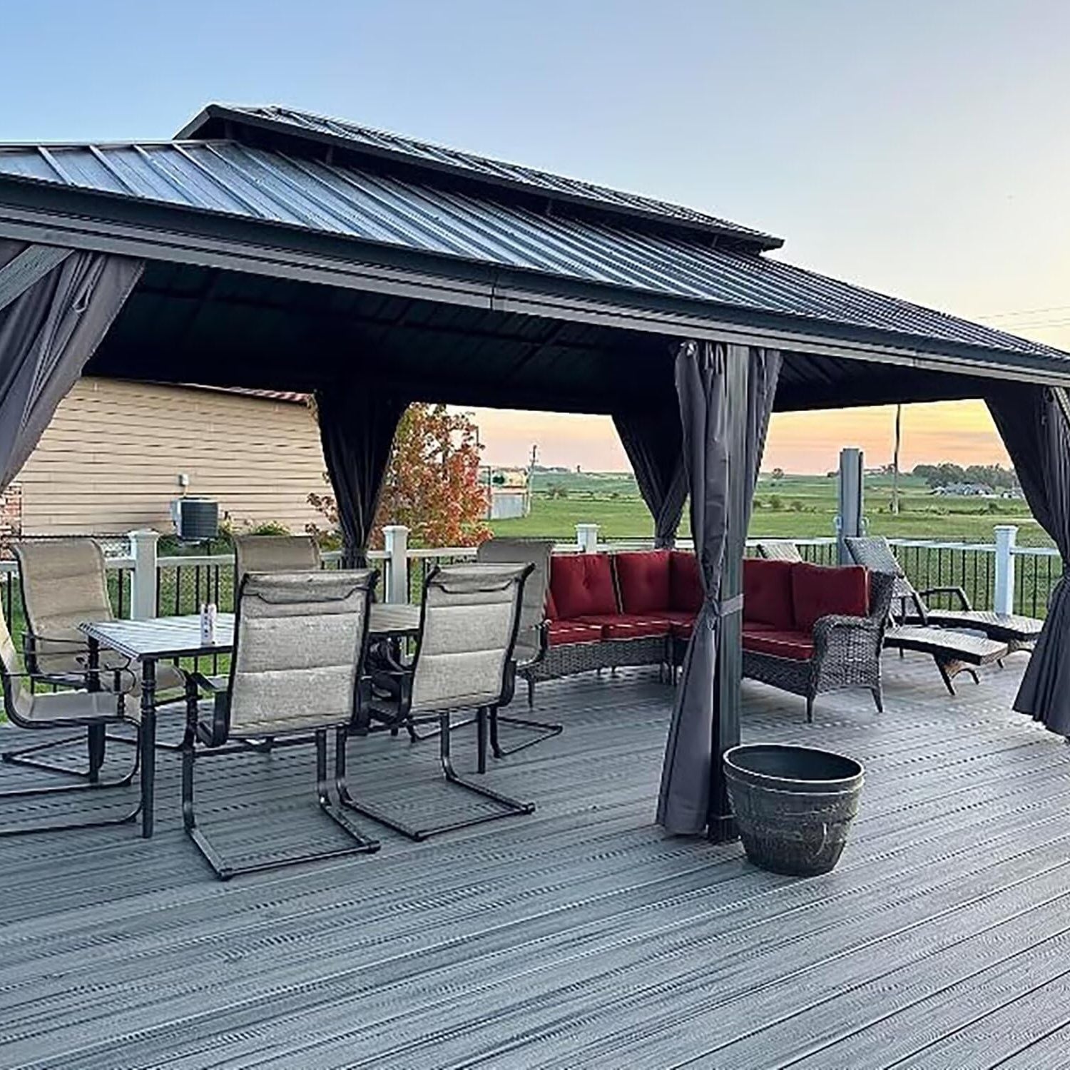 - 🏡Galvanized Steel Double Roof: Domi gazebo 12x20 is all weather resistant and strong enough to withstand 2500 LBS of snow.Double-layer with built-in netting can prevent fallen leaves and keep air circulating.Hooks on the inner top can hang lights or fans.