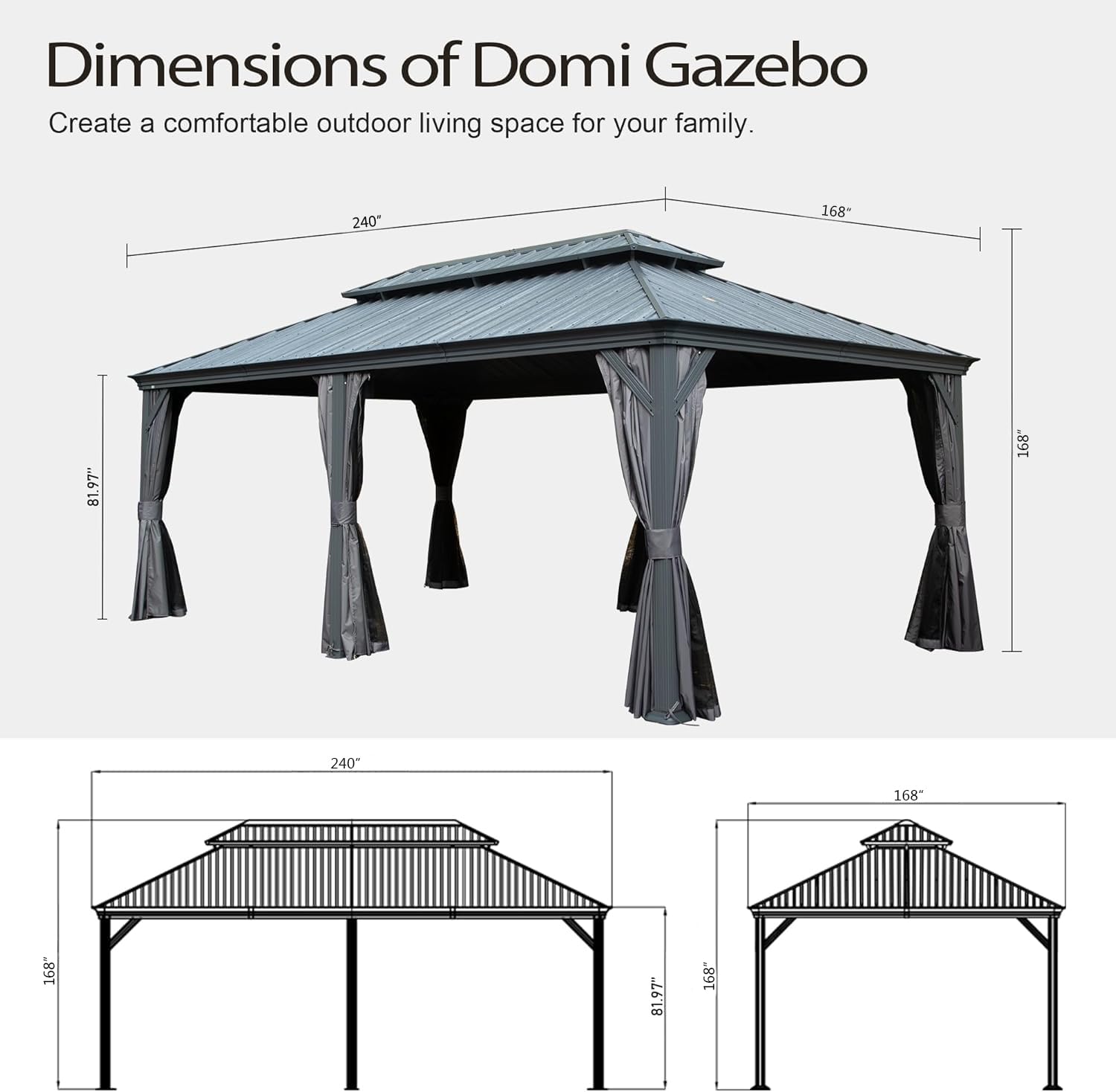 • Ventilated Double Roof Design: Stay cool all summer long with the Domi gray hardtop gazebo 14x20FT! Its ventilated double-roof system promotes excellent airflow, keeping your outdoor space comfortable even on hot days. Enjoy the breeze in your Domi Outdoor Gazebo!
