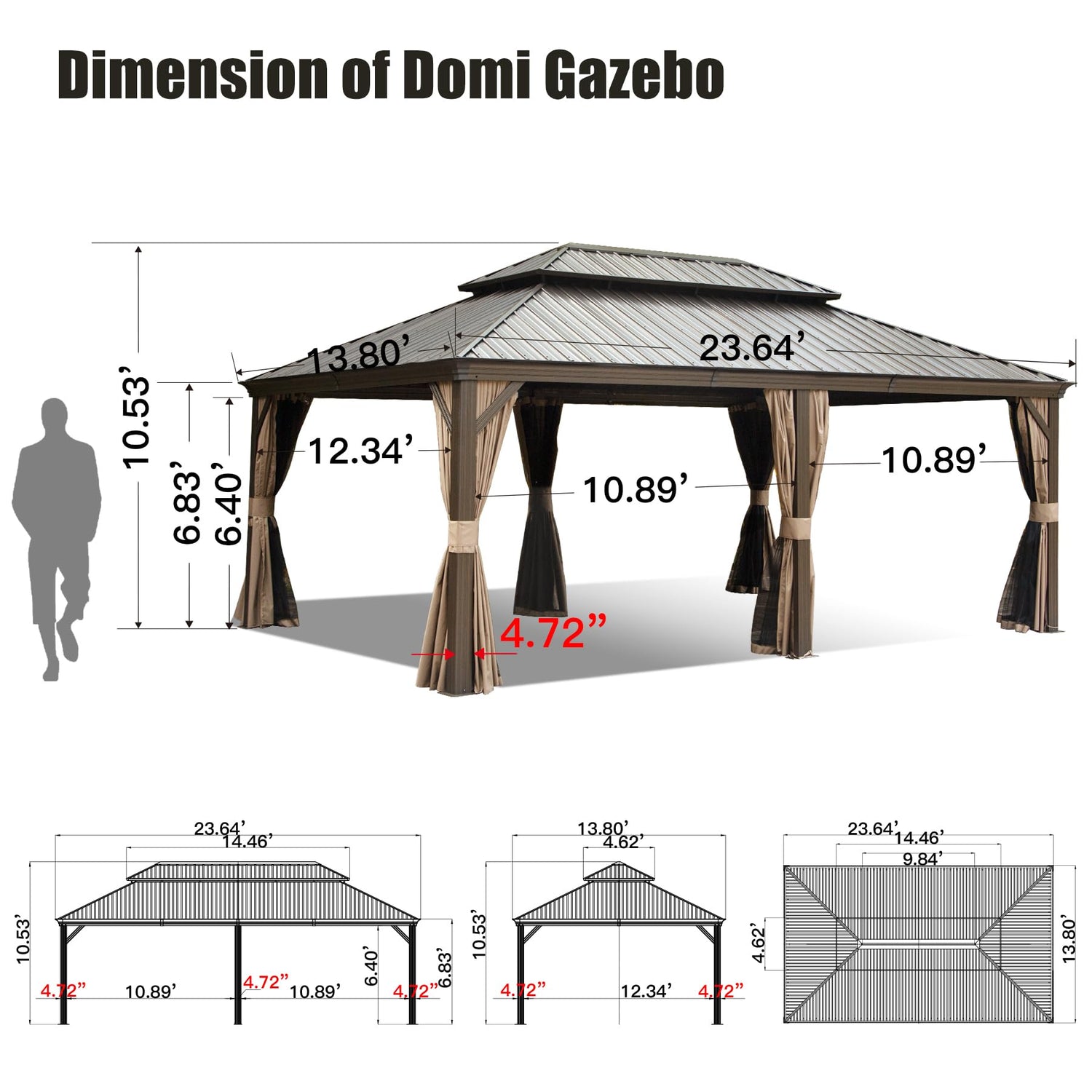 • Sturdy Aluminum Frame: Powder coated Natural dark brown aluminum frame,resistant to fading, rust and corrosion. Built with 4.72"x4.72" aluminum stand pole and comes with pre-drilled base for each post,domi 14x 24 gazebo can withstand a wind rating up to 40 MPH.