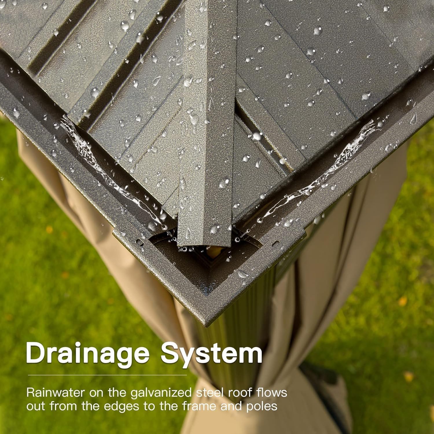 • Water Gutter Design: Sloped roof designed to allow water to drain quickly, and the water gutter design of this domi gazebo ensures the rainwater drain quickly from the edge of frame and down to the pole,prevent rainwater accumulation