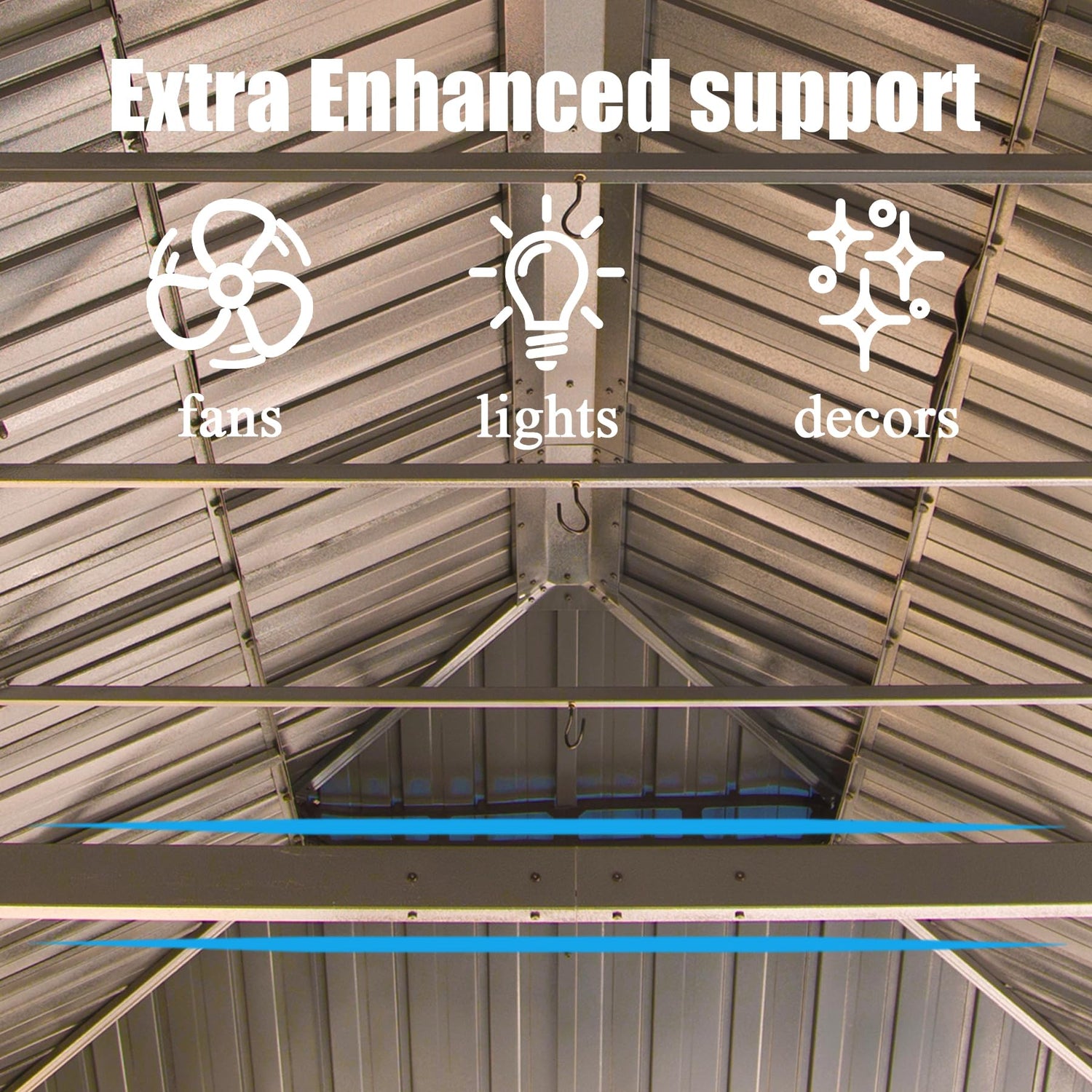 • Galvanized Steel Double Roof: Domi gazebo 14x24 is all weather resistant and strong enough to withstand 2500 LBS of snow.Double-layer with built-in netting can prevent fallen leaves and keep air circulating.Hooks on the inner top can hang lights or fans.