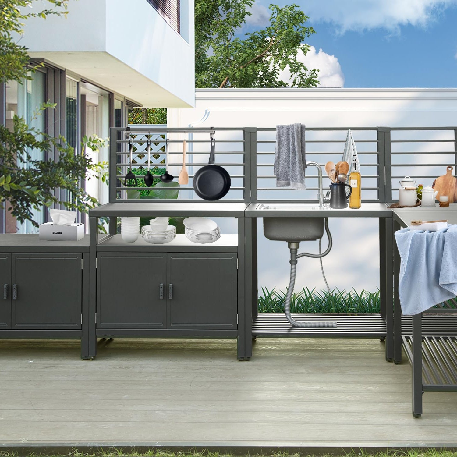 Domi 5-Piece Outdoor Kitchen Island with Storage, Aluminum Kitchen Islands Stainless Steel Sink w/Faucet, Corner Bar Storage Cabinet, Outdoor Kitchen with Protective Cover for Deck, Patio