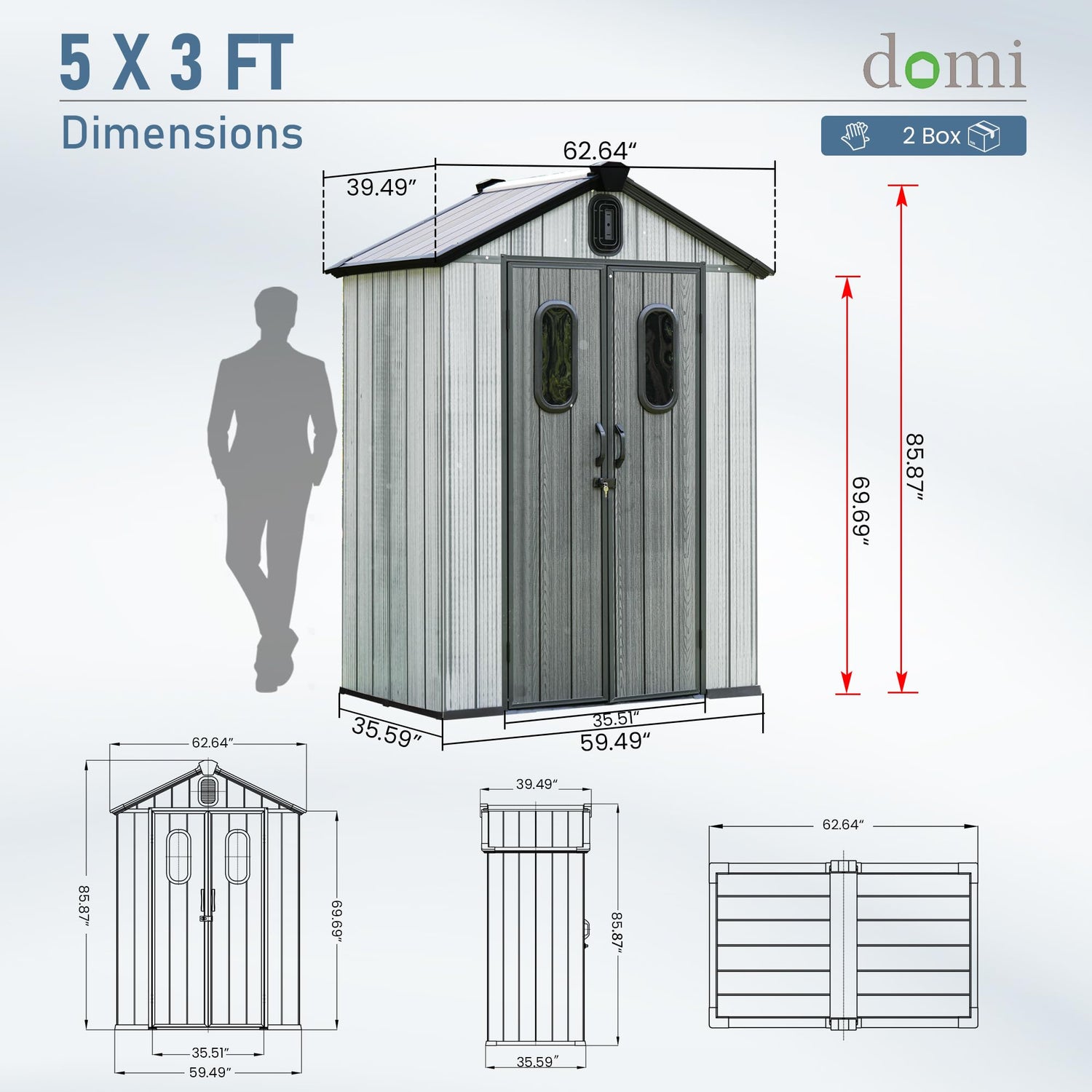 Domi 5x3 FT Outdoor Resin Storage Shed, All-Weather Double-Wall Storage Building for Backyard, Garden, Lawn Tools, Mower, Bike & Pool Equipment, Lockable Doors, Ventilated Roof, Grey