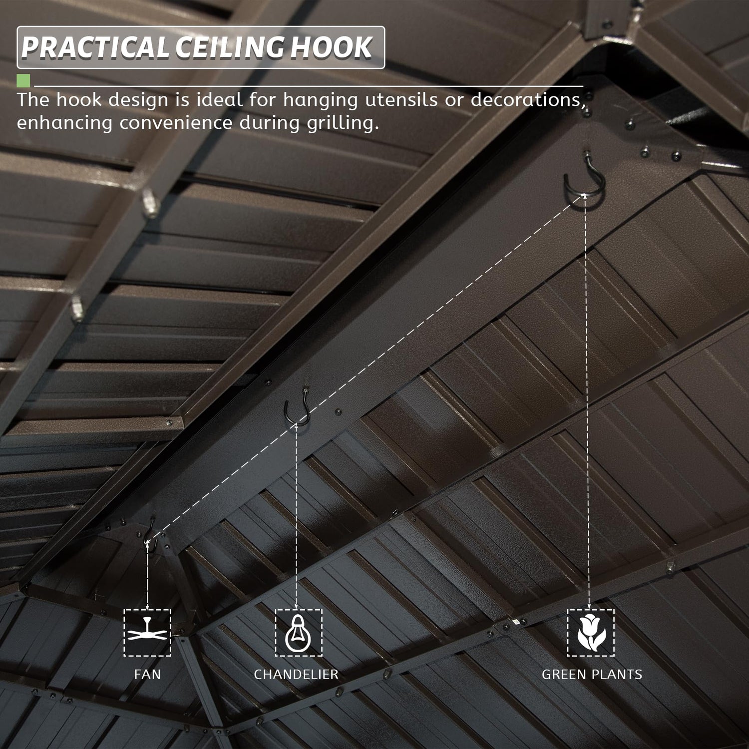 - Versatile Ceiling Hooks: Enhance the versatility of your hardtop grill gazebo with durable ceiling hooks, ideal for hanging lights, fans, BBQ tools, or decorative items.Set up the perfect outdoor space for cooking and entertaining in any weather, with all the essentials easily within reach.