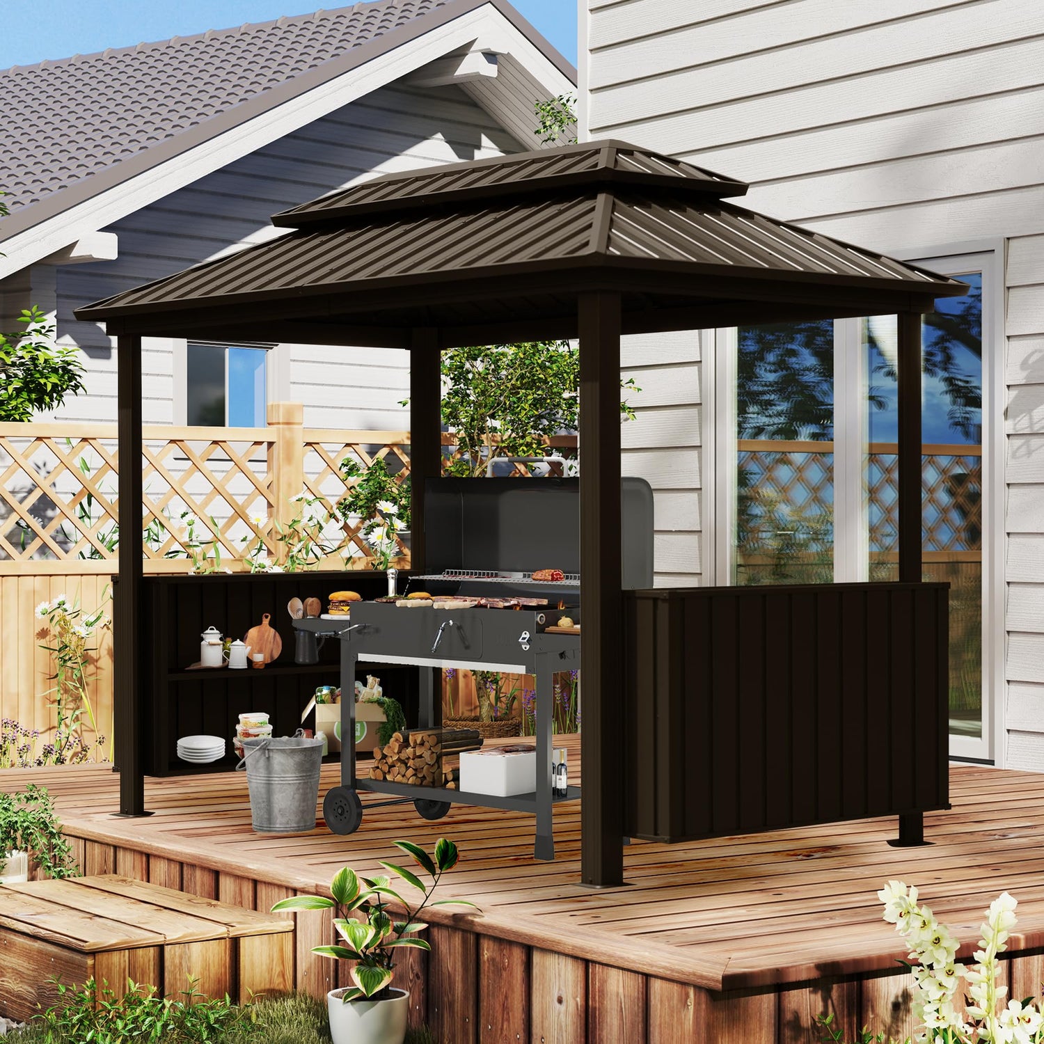 Domi 6x10FT Hardtop Grill Gazebo, Outdoor Metal BBQ Gazebo with Galvanized Steel Double Roof, 2 Double-Layer Storage Cabinets and Ceiling Hooks, Permanent Grill Canopy for Patio Backyard Garden,Brown