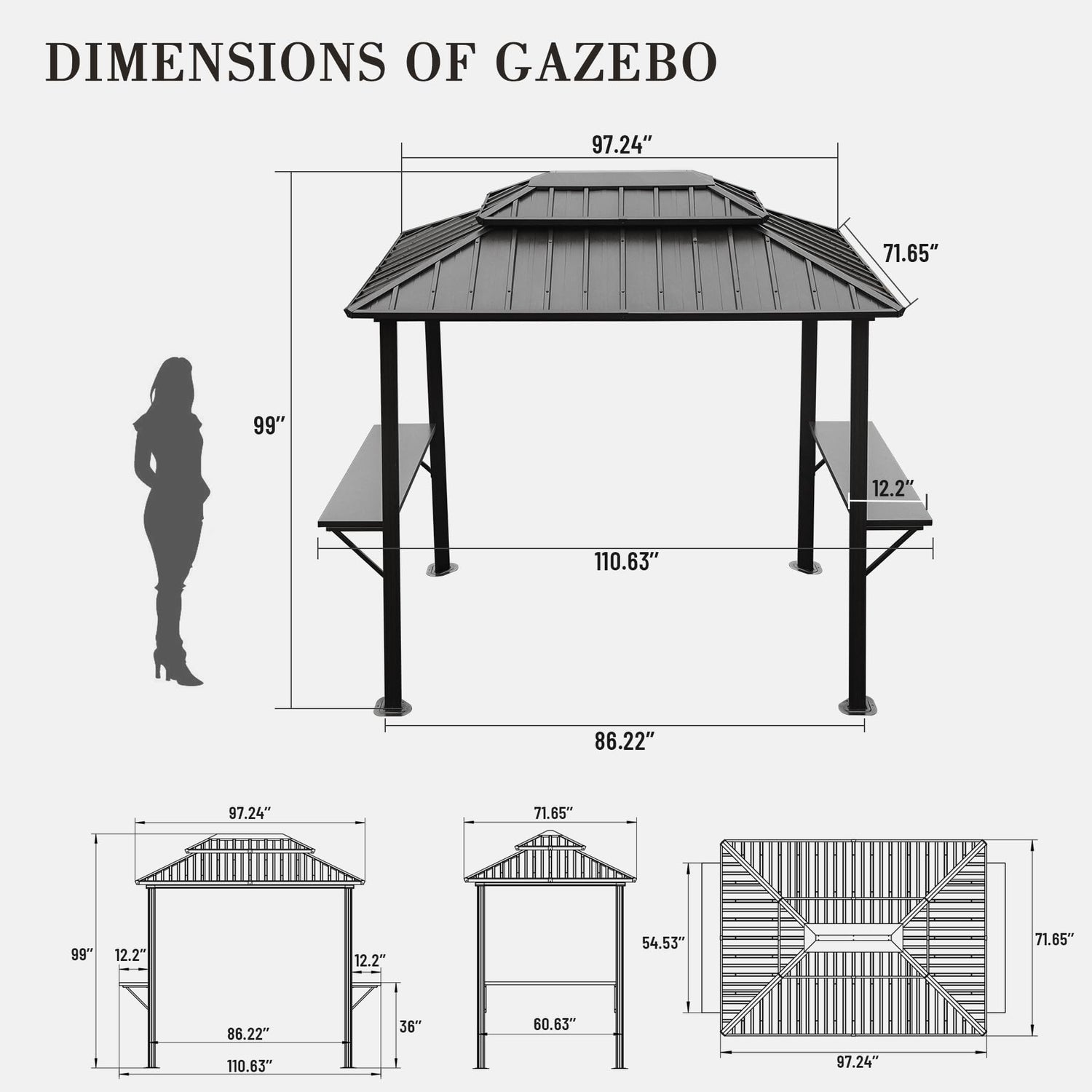 - 🌞Wonderful Grilling Shelter- With dimensions of 97.24"L x 71.65"W x 99"H, this hardtop gazebo accommodates most barbecue grills, providing an ideal setting for BBQs and parties in the backyard, poolside, lawn, or garden, allowing for enjoyable outdoor time with family, friends, and children.
