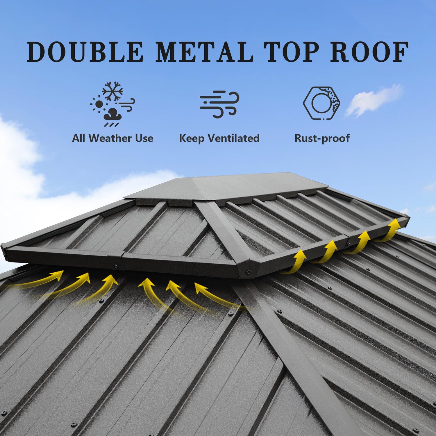 - 🌞Double-Roof Design- The Domi 8' x 6' BBQ gazebo features a double metal roof design, allowing smoke from the grill to disperse quickly and facilitating drainage during rainy days, preventing water accumulation.