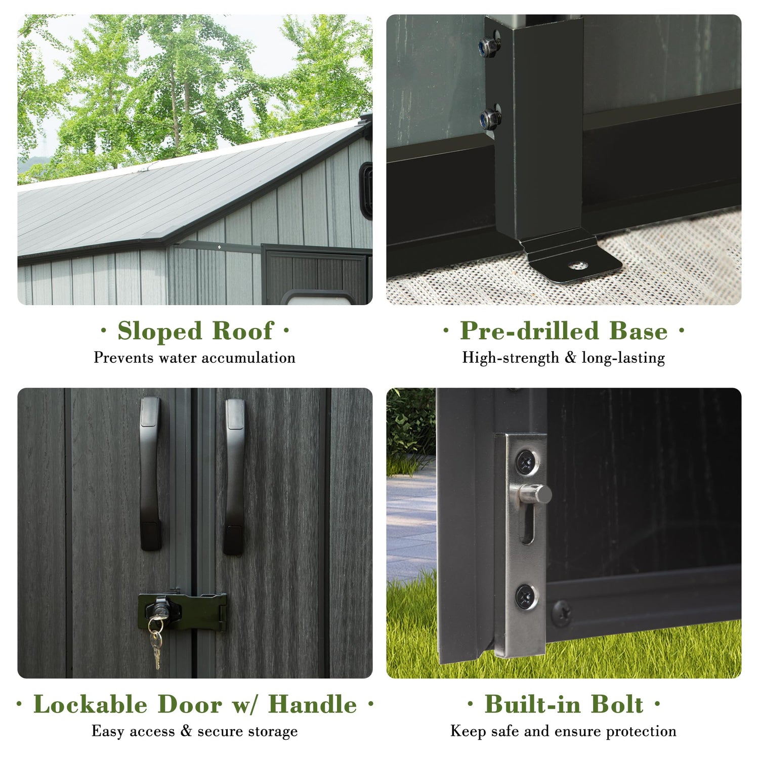 - Durable Resin Shed: Unlike conventional metal storage shed, resin sheds deliver superior environmental benefits while being rust-proof and corrosion-resistant for long-term durability. The construction eliminates sharp edges, preventing accidental scratches during use.