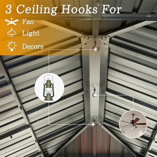 - [Classic Design] The domi backyard gazebo features a traditional and elegant appeal, as well as a sleek and minimalist appearance that will match the overall design and layout of your yard or patio. The area between the 2 roof levels allows air to circulate, resulting in a ventilation system that keeps the gazebo cool and pleasant on summer days. Furthermore, the slope of the roof allows rain and snow to flow down and off the structure, lowering the risk of damage and providing a resilient roof.