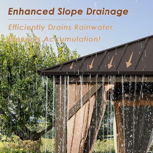 - [Classic Design] The domi backyard gazebo features a traditional and elegant appeal, as well as a sleek and minimalist appearance that will match the overall design and layout of your yard or patio. The area between the 2 roof levels allows air to circulate, resulting in a ventilation system that keeps the gazebo cool and pleasant on summer days. Furthermore, the slope of the roof allows rain and snow to flow down and off the structure, lowering the risk of damage and providing a resilient roof.
