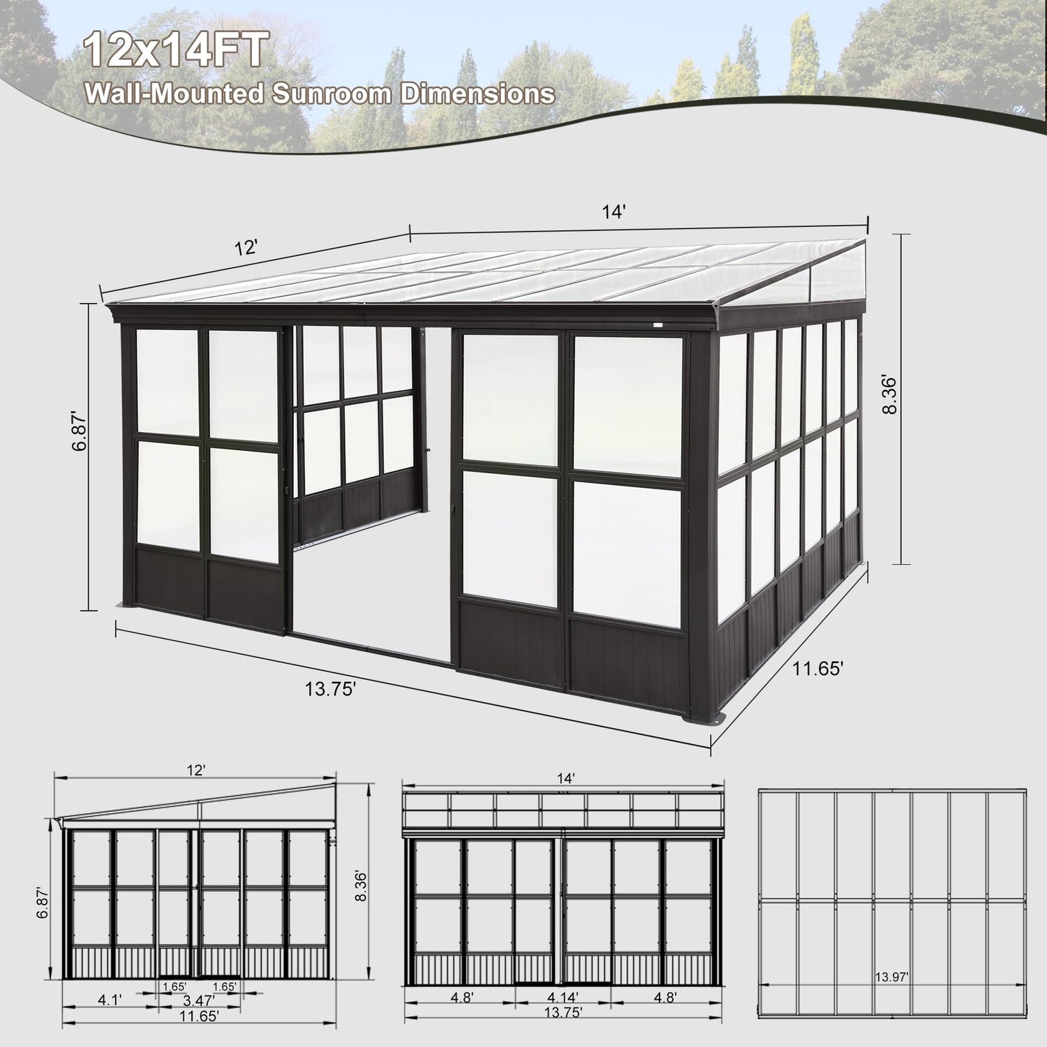 Domi Lean-to Sunroom 12x14FT, Wall Mounted Solarium with Sloping Polycarbonate Roof, Detachable Polycarbonate Screens, 2 Lockable Sliding Doors, Aluminum Gazebo Against Wall Sun Room for Patio Deck