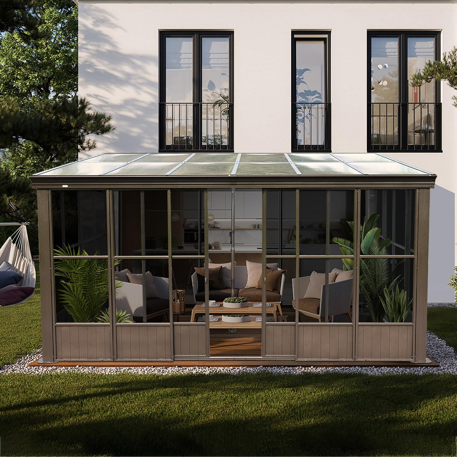 Details: Step into your own spacious sanctuary with the Domi wall-mounted sunroom, offering a generous area of 13.75’L x 11.65’W x 8.36’H for relaxation and entertainment. The redesigned sunroom features durable polycarbonate panels and a sturdy aluminum frame, ensuring stability, weather resistance, and longevity. The UV-treated polycarbonate rooftop blocks up to 99% of harmful UV rays while allowing natural light to filter through. A thoughtful sloping drainage system ensures efficient rain and snow runoff, while double sliding doors provide convenient access and seamless integration between indoor and outdoor spaces. Enhanced with detachable polycarbonate screens for privacy and protection, breathable mesh screens for air circulation, and an extra metal support pole for heavy snow conditions, the Domi sunroom is designed for comfort, durability, and year-round enjoyment.